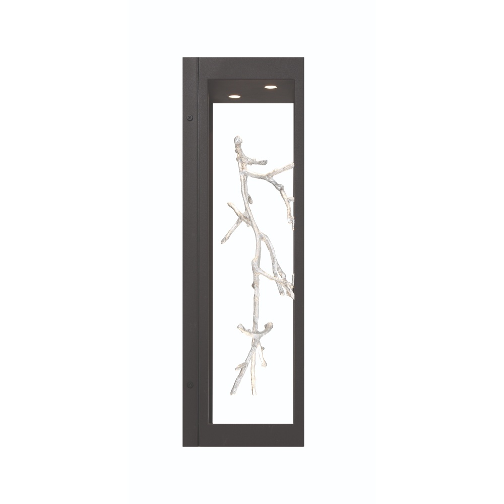 Free-flowing, gilded branches of gold and silver float elegantly within a stylish open cage constructed of cast brass and finished for the rigors of outdoor environments. The thin twigs are handcrafted with metal foil and accentuated by pinhole recessed LED lighting to add a luxurious glow to this nature-inspired collection.