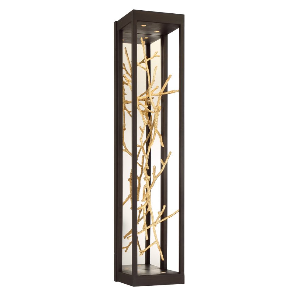Free-flowing, gilded branches of gold and silver float elegantly within a stylish open cage constructed of cast brass and finished for the rigors of outdoor environments. The thin twigs are handcrafted with metal foil and accentuated by pinhole recessed LED lighting to add a luxurious glow to this nature-inspired collection.