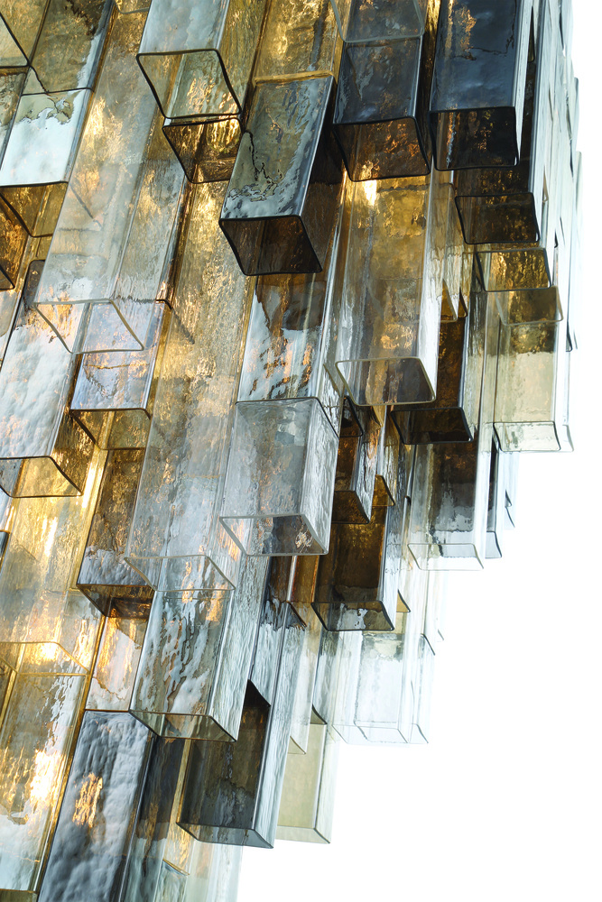 A series of stepped square balusters are the backbone of a staircase; adding grace and strength to a functional element in a building. Using this same tiered visual, Altesa dresses square frames with elongated square tubes of glass. The varying lengths, tones and densities of glass influence the depth and color of light, presenting a mesmerizing display in grand proportions.