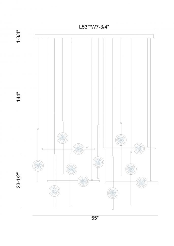 Various sized anodized rods suspend vertically in black or gold finishes. Each rod is furnished with a clear seeded glass orb that perfectly sits within an anodized ring.