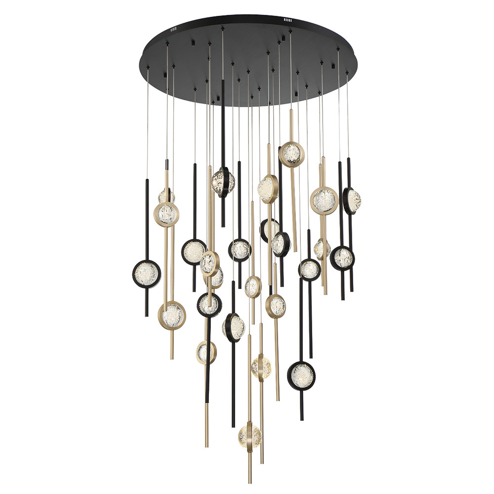 Various sized anodized rods suspend vertically in black or gold finishes. Each rod is furnished with a clear seeded glass orb that perfectly sits within an anodized ring.