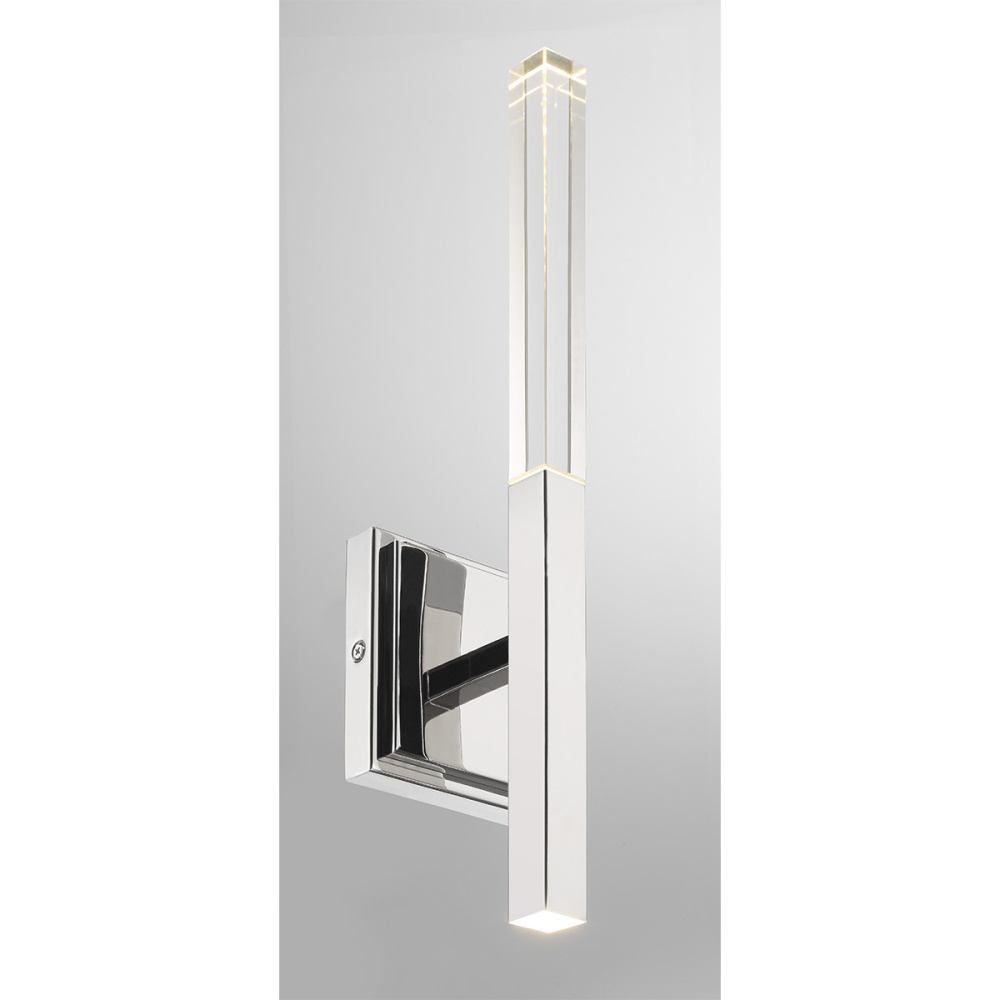 Its crystal rectangular prism and sharp beveled edges create brilliant illumination to the Benicio collection. Solid glass vertical spires cast vivid refractions across wall and ceiling surfaces. The thin simple geometric shape lends itself to luxurious and contemporary environments while providing a dual LED light source.