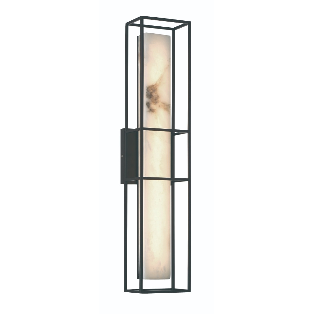 Organic and industrial have been combined. The softness of one piece, hand carved alabaster surrounded by a metal frame to represent the yin and yang in exterior design. Natural alabaster may show variations in color and texture.
