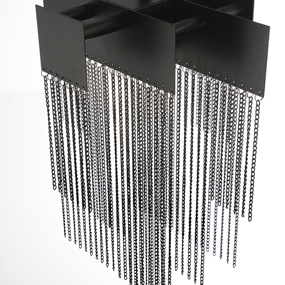 A lustrous collection of delicate, high-gloss metal chains cascade like gleaming streams of water in this transitional piece. Resembling armored chain mail, the polished, plated mesh envelops each integrated LED light to add a soft, shimmering glow.