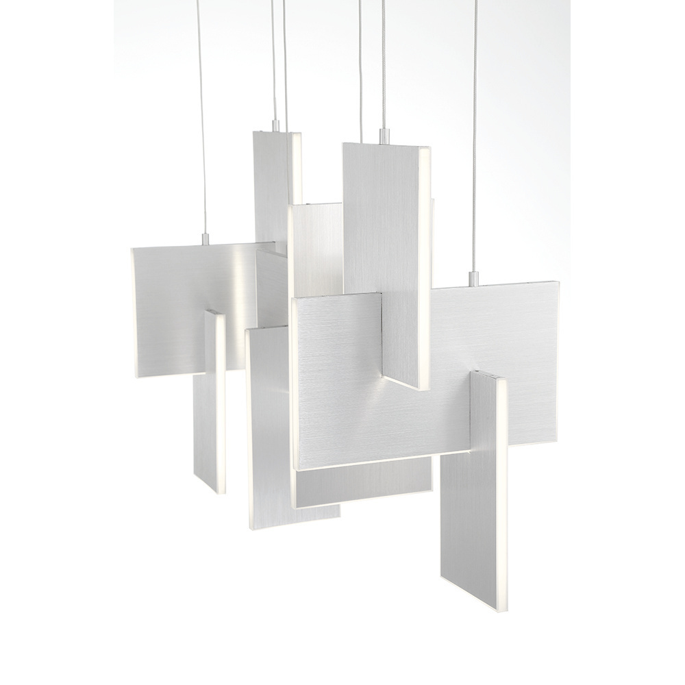 Slim, edge-lit LED panels are creatively positioned to intersect in a dynamic, whimsically modern design. A continuous run of LED lights delivers seamless, multi-directional lighting. The interlocking aluminum panels are laser cut for added precision and anodized to create a durable, corrosion-resistant finish that’s available in either gold or black.