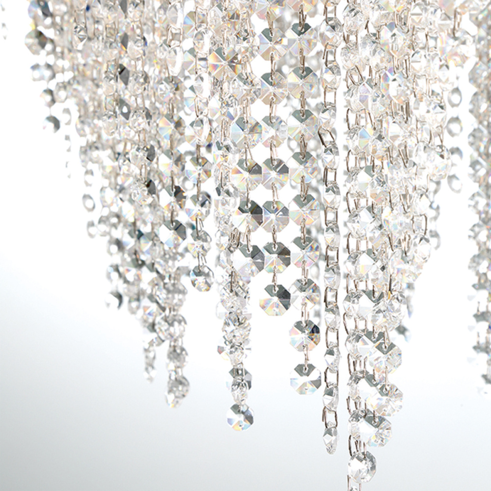 This unique star patterned veil suspends draping crystal beads, adding dimension and texture to this grand scale fixture. New to the collection is the addition of an oval chandelier