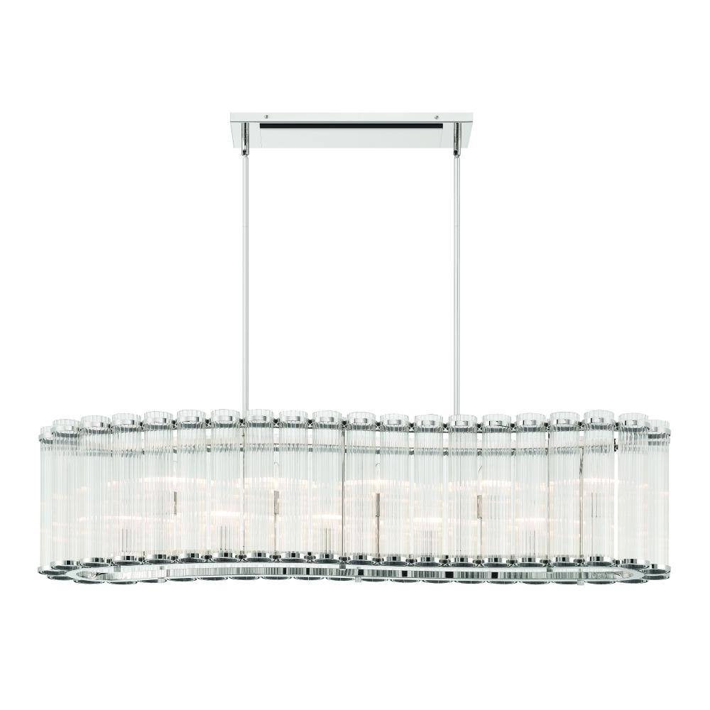 A regiment of ribbed cylinders, linked together at the top, encircle the central light sources to soften and diffuse, unveiling a stately, transitional allure that lends charm to living, entry and dining spaces.