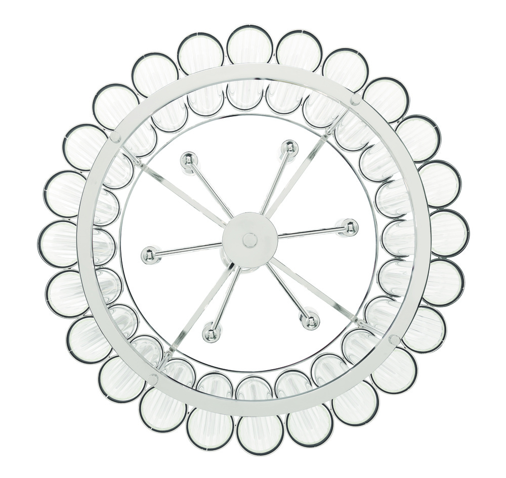 A regiment of ribbed cylinders, linked together at the top, encircle the central light sources to soften and diffuse, unveiling a stately, transitional allure that lends charm to living, entry and dining spaces.