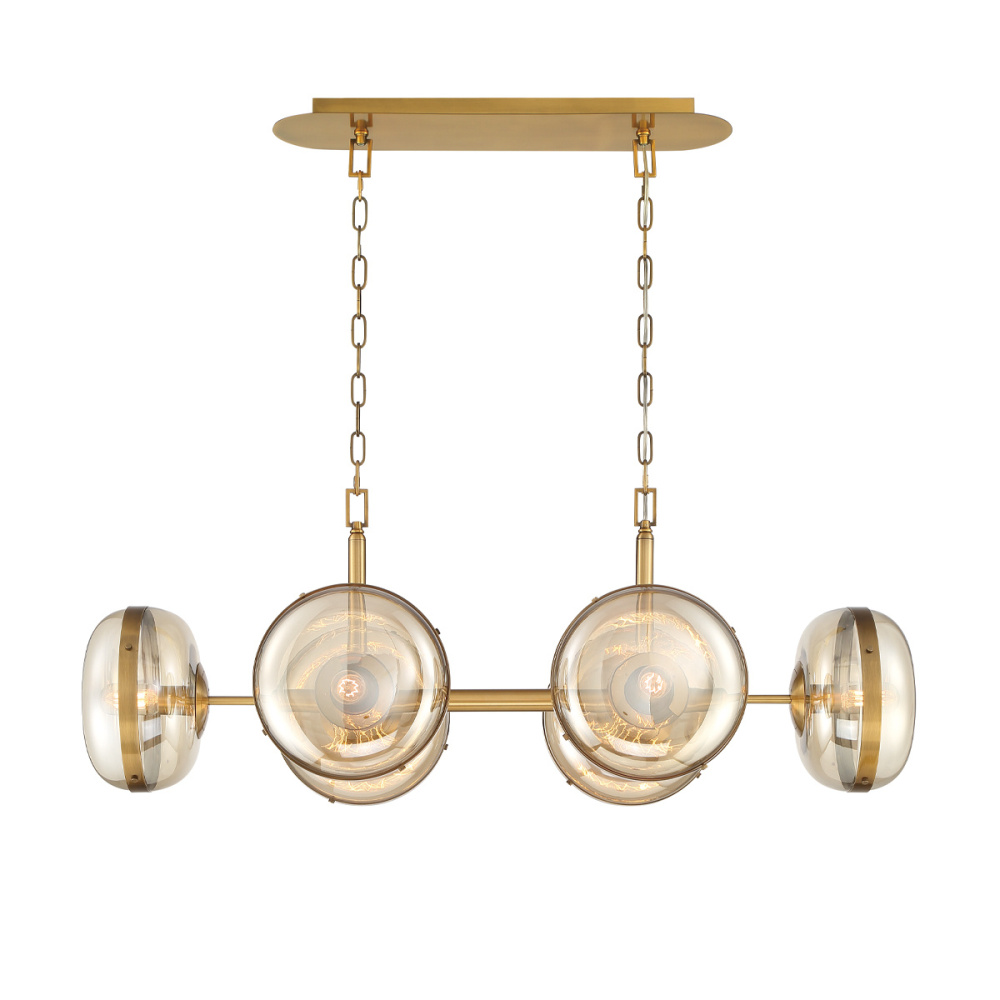A band encircles each glass orb that beautifully reflects a warm glow from the vintage lights within. The metal support creates an inviting counterpoint to the austere design