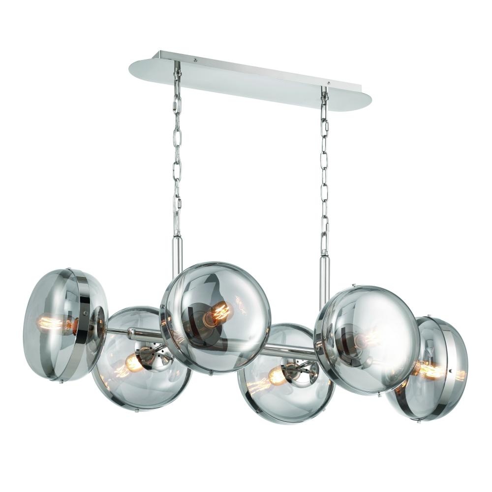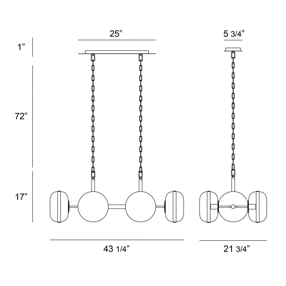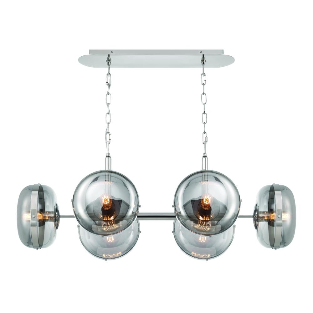 A band encircles each glass orb that beautifully reflects a warm glow from the vintage lights within. The metal support creates an inviting counterpoint to the austere design