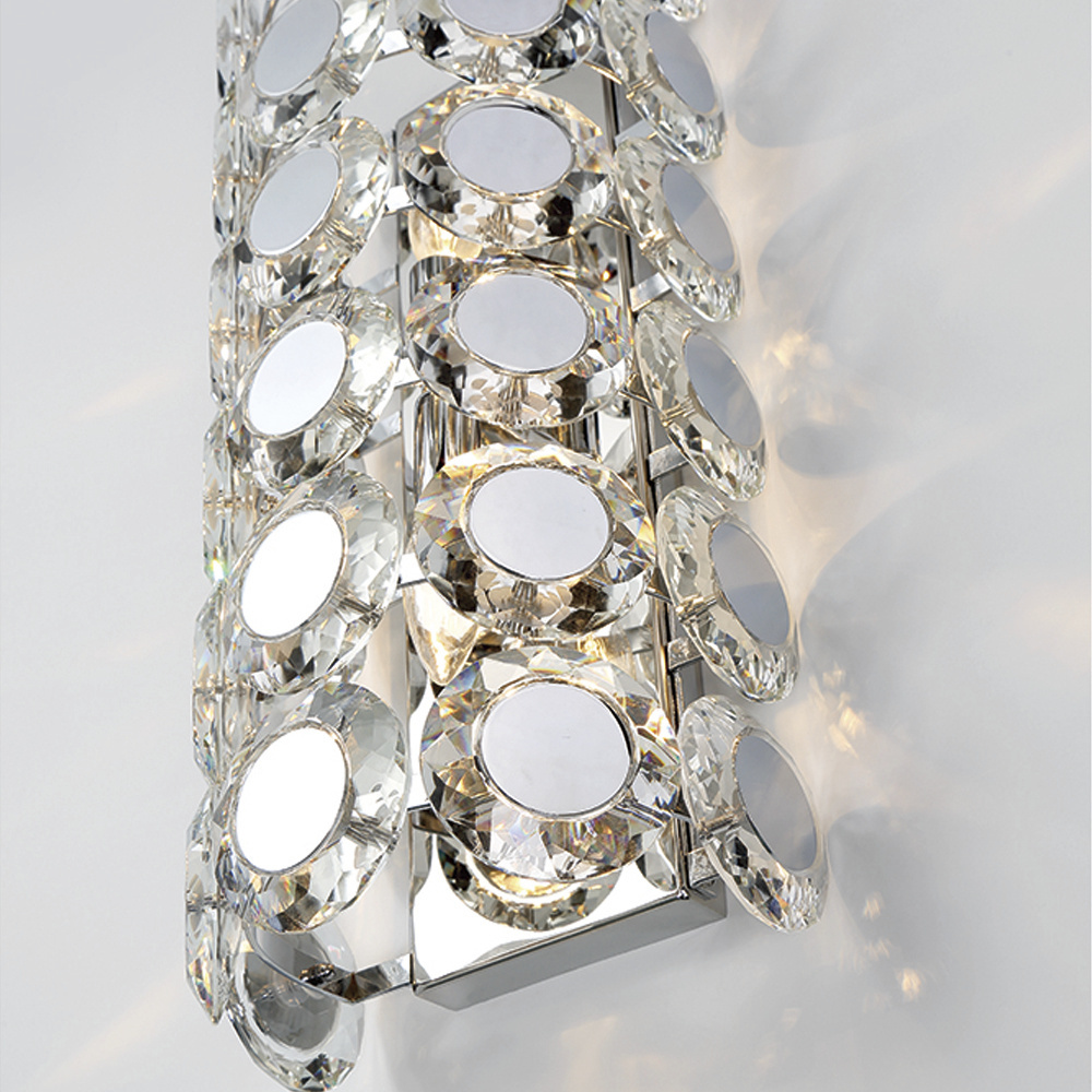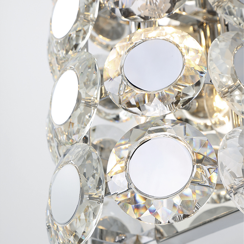 Our lavish Perrene collection is a true statement piece; ordained with coveted crystals, both sides showcase bevelled texture that brings dramatic elegance. The mirrored chrome center helps reflect the light for an even more opulent display of light. Indulge with the Perrene collection today.