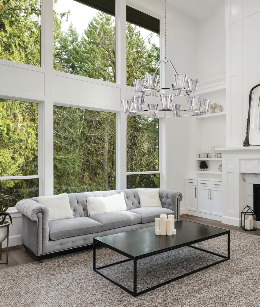 Individual crystal prisms encircle a chrome ring, creating a tapered form for each shade. The clear crystals with their high quality brilliance embellish this collection extravagantly. Create a glamorous setting with the dazzling display of lights that are refracted from the crystals and polished chrome.
