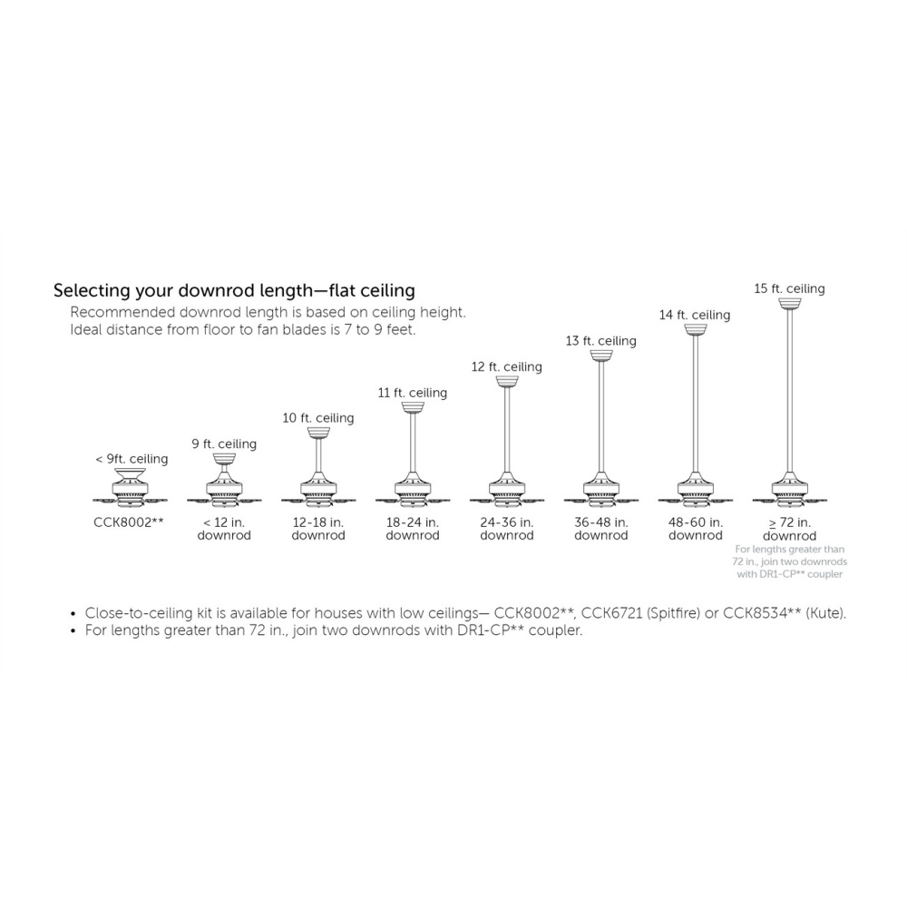 Optional downrods are available in lengths up to 72 inches to adjust the fans height between 7-ft to 9-ft from the floor, ensuring maximum airflow.