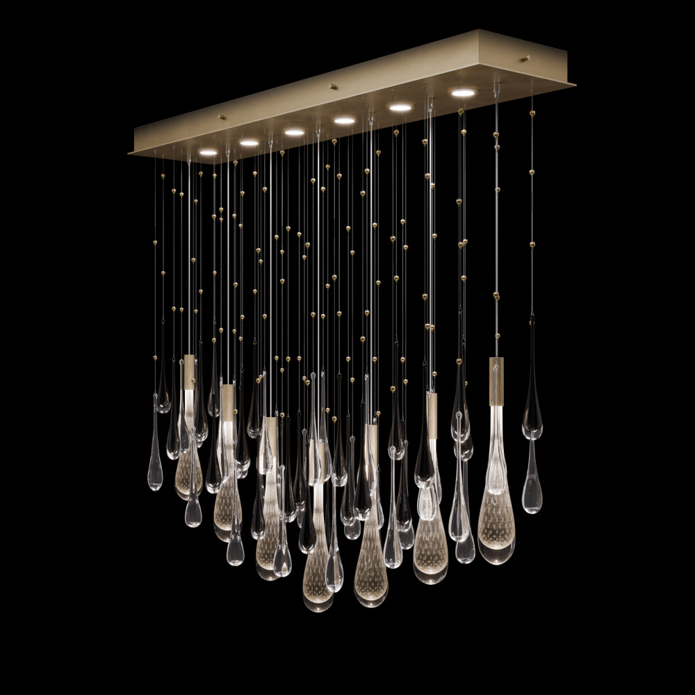 This LED pendant captures the beauty of motion suspended in time-artisan-blown glass “rain” drops infused with swirling mist and illuminated from within. Offered in Silver, Gold, or Copper drops, each paired with clear and black droplets and complemented by a hand-applied ombré finish that enhances its luminous depth.