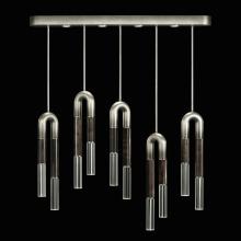 Linear five-drop pendant featuring soft curves and the inclusion of metals carefully handcrafted to transition from parchment to magnificent glass, culminating in a stunning beam of light. Suspended by connectable rod segments for a customizable length. Available in a wide range of exquisite finishes, including our five standard finishes and our newest Soft Ombre Bronze & Soft Ombre Silver, with the choice of two parchment colors, Charcoal and Smoke. Also available with no parchment.