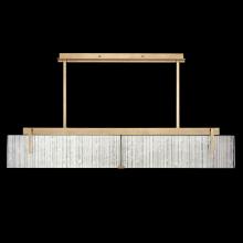 Linear LED pendant featuring highly polished parallel forms of rich textured, hand-cast crystal in a clear or Gold Leaf choice. All available in three standard finish options, Soft Gold Leaf , Silver Leaf, or Black Iron. Shown in Black Iron with clear glass.
