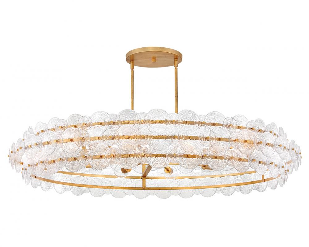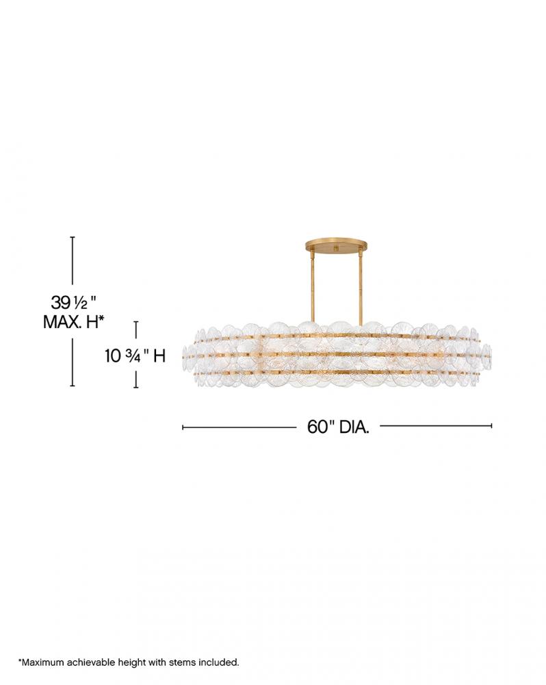 Rene radiates light through multiple layers of beautiful, pressed glass disks. Rene’s signature touch highlights a Distressed Brass finish, evoking both transitional and glam influences.