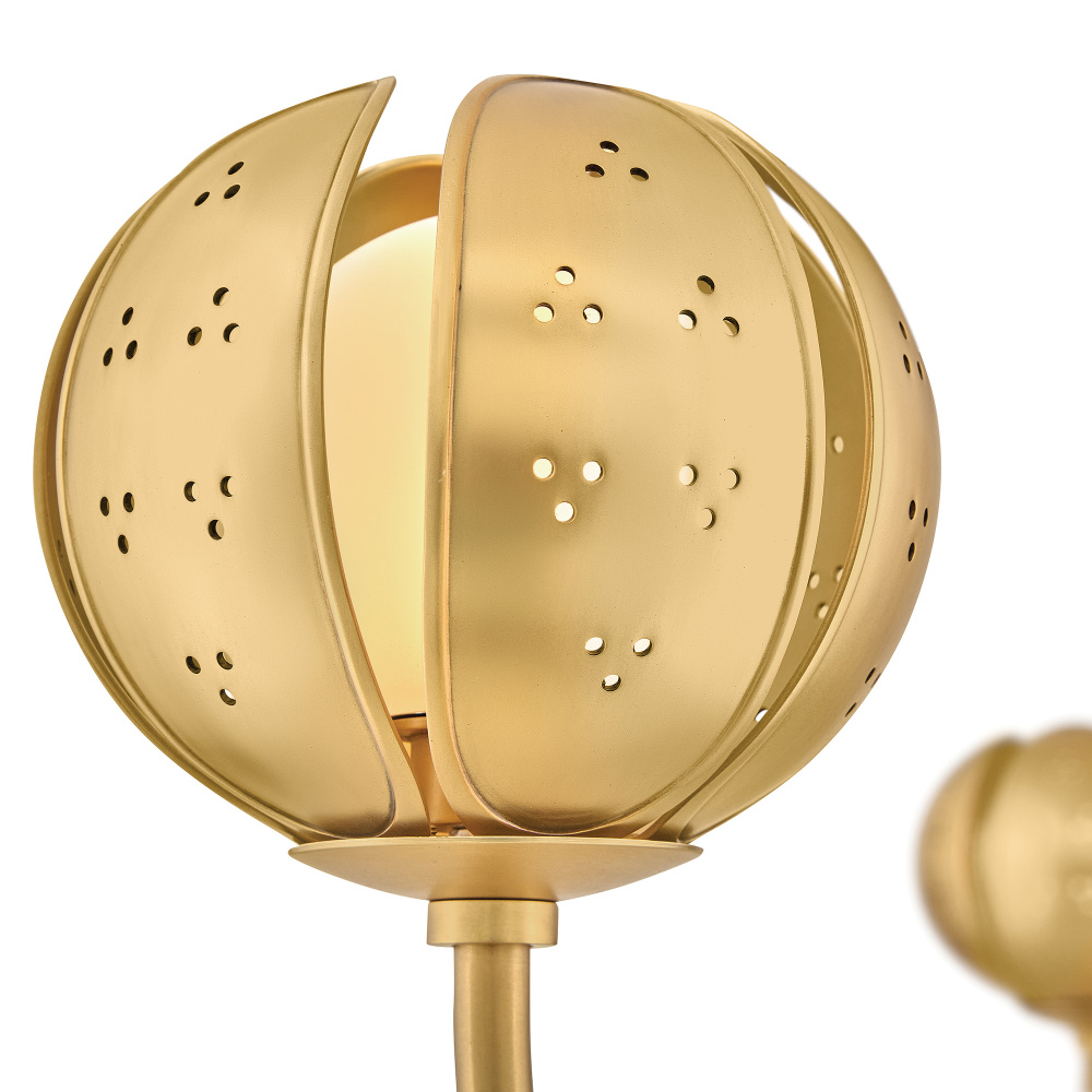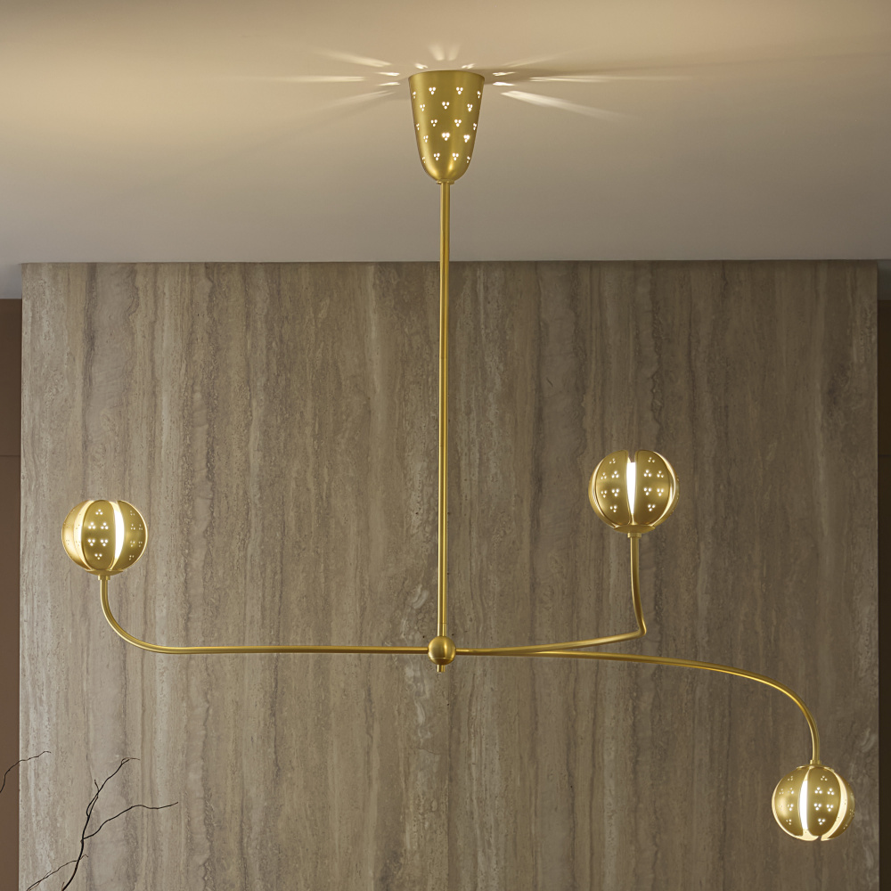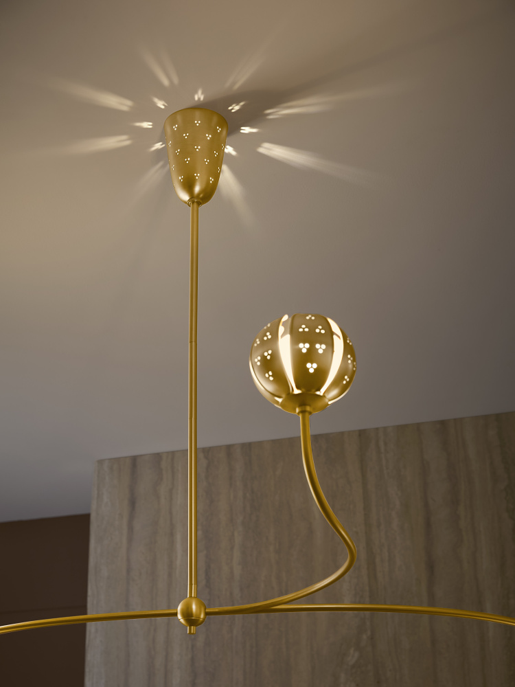 A work of luminary art, Anthos elevates its floral-inspired form with alluring illumination. Raised edge details and distinct perforations accentuate each blossom crafted from solid unlacquered brass petals. Radiant LED lamps enveloped by blown etched opal glass transform the surrounding space with a captivating interplay of light and shadow.