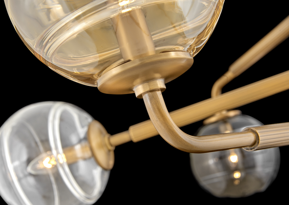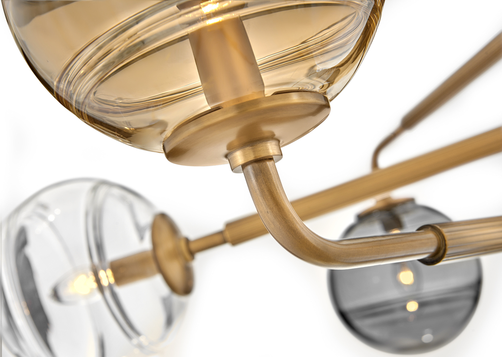 Artfully combining unexpected materials and innovative technology, Oberon's ribbed stems and articulating arms in Heritage Brass allow for a tailored, transitional silhouette. Delicate swirls detail spherical shades in amber, clear, and smoke glass.