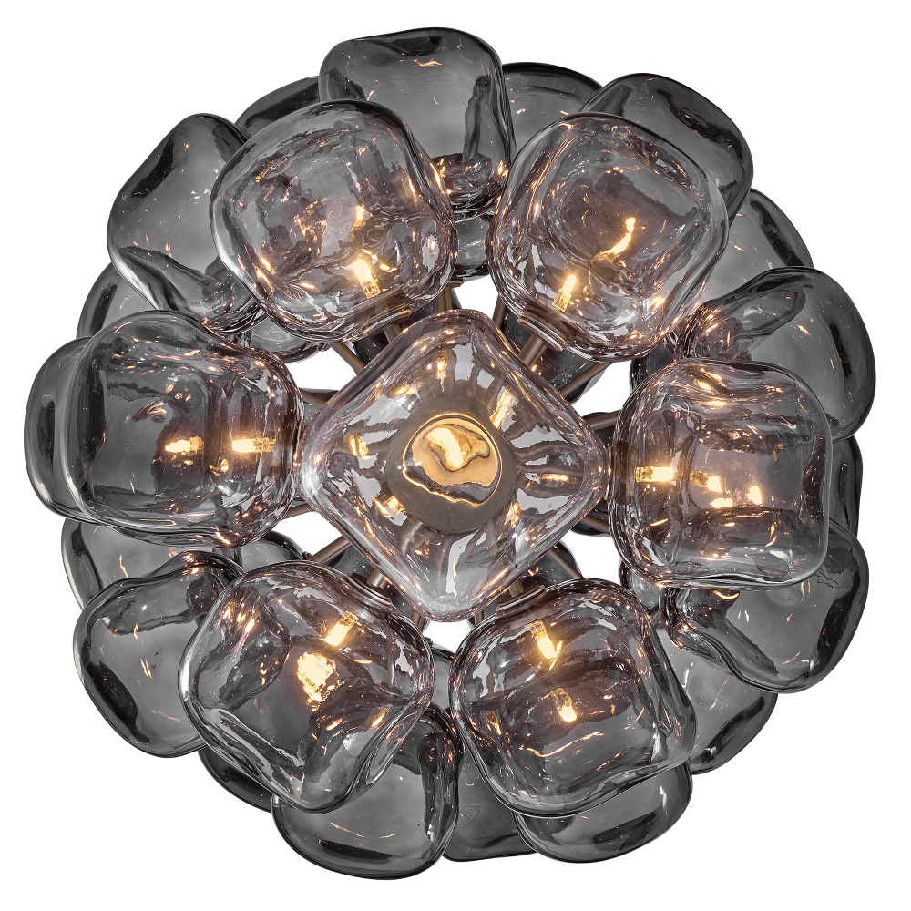 Inspired by the glamour of gemstone-adorned jewelry, Perriand’s varying hues are arranged in a striking ombre, transitioning from Smoke or Light Amber glass to clear glass. An intricate frame, rounded canopy, and slender stem in timeless finishes complete this contemporary art piece, making a striking modern statement in any setting.