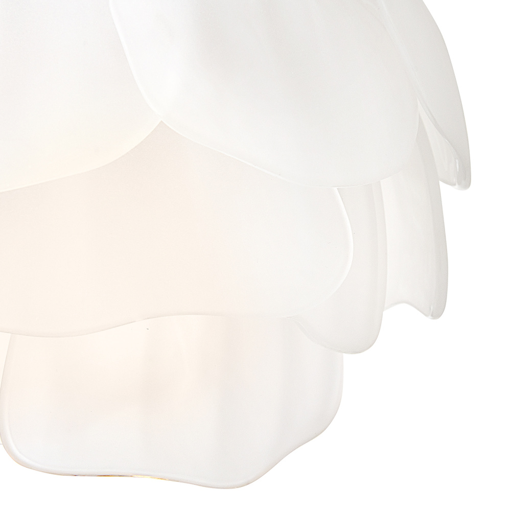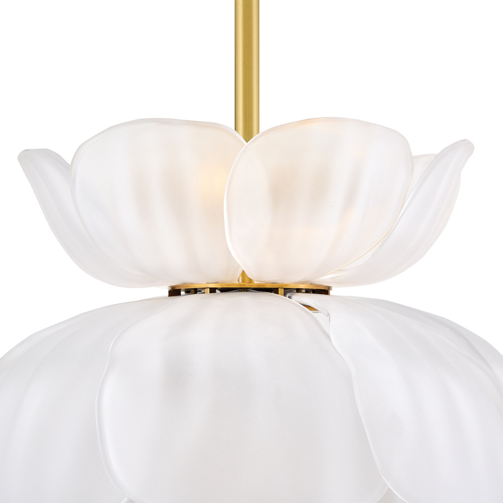 Fantine’s flowing blooms are inspired by preserved flowers suspended in time. Uniquely shaped artisan-sculpted glass arranged in lush layers creates an ethereal dance of light and shadow. An exaggerated canopy and slender stems are crafted from solid brass in a hand-touched Unlacquered Brass finish.