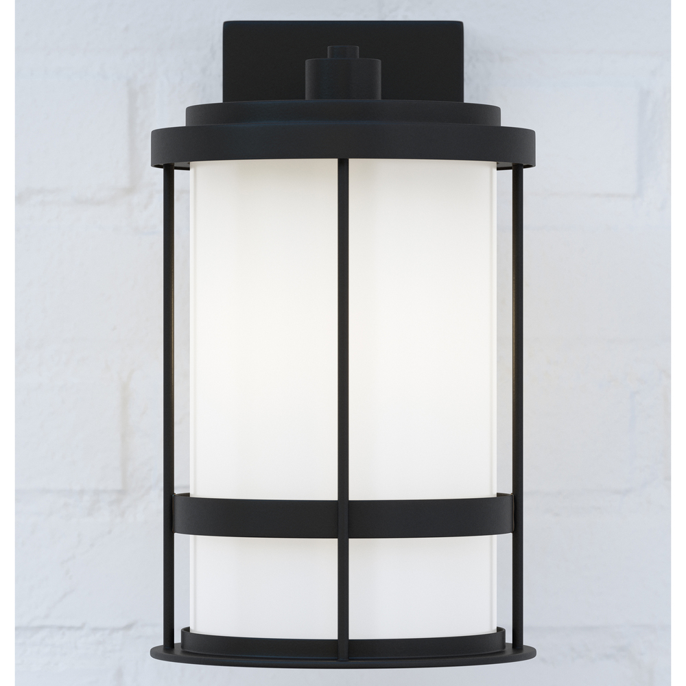 Wilburn modern 1-light outdoor exterior medium wall lantern sconce in black finish with satin etched