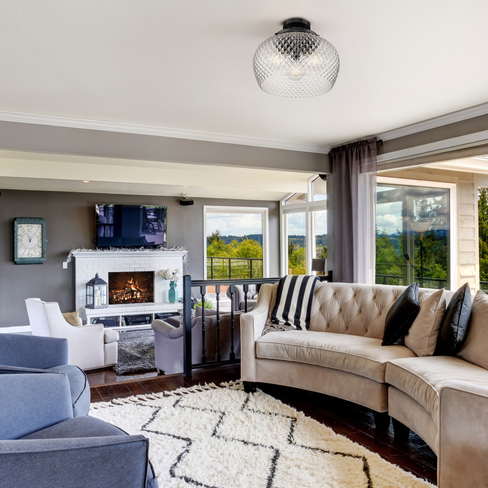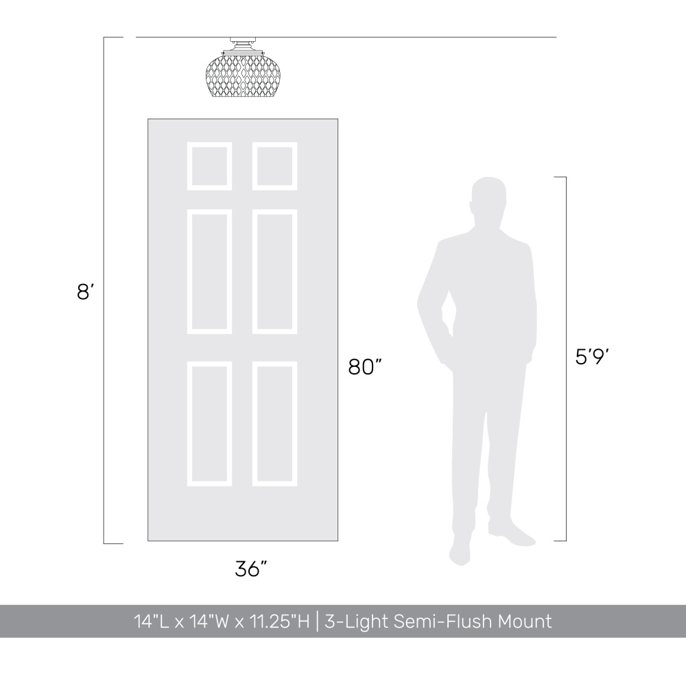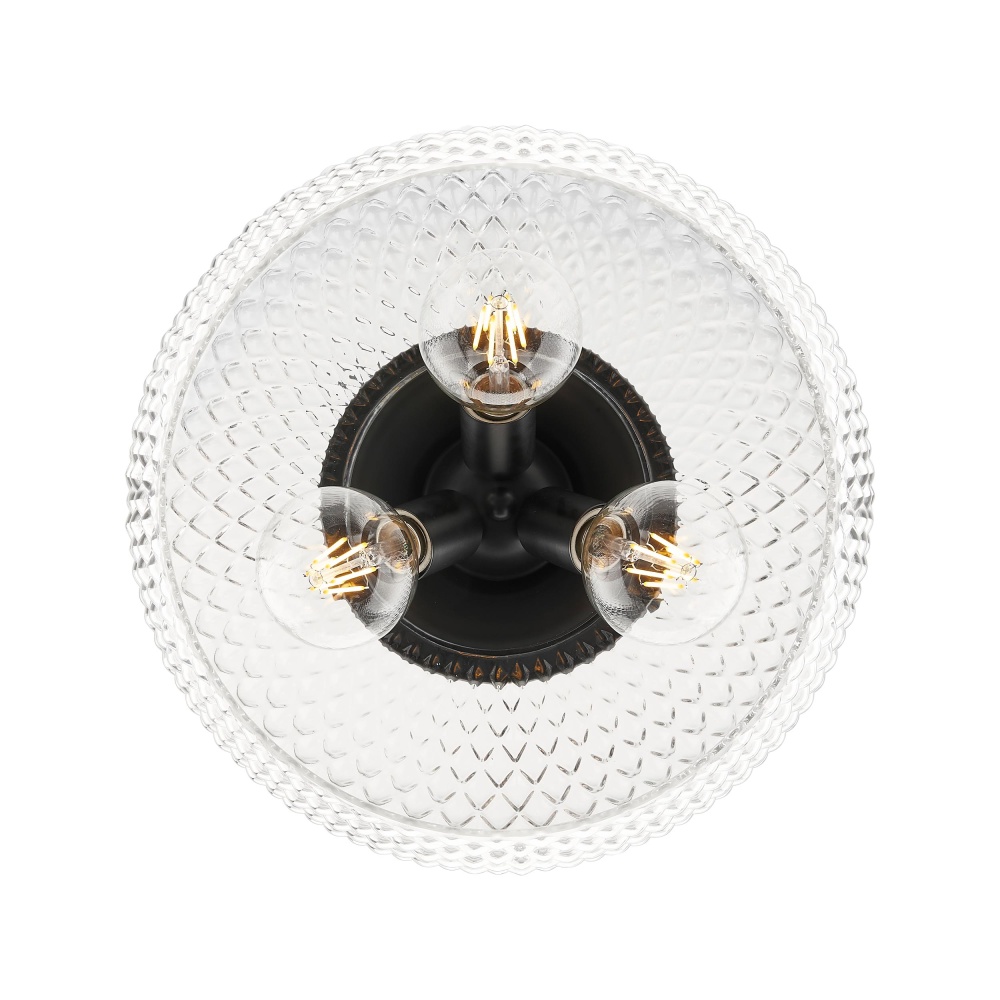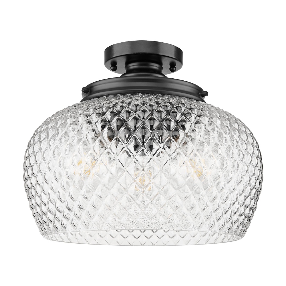 Bring farmhouse elegance into your home with the Golden Lighting Adeline 3-light Semi-Flush Mount. Featuring a glass shade and a Matte Black frame, it creates a welcoming atmosphere. The clear glass shade allows for brilliant, unobstructed light, perfectly showcasing the warmth and character of your bulb. Its polished finish enhances the overall aesthetic while providing a vintage-inspired touch. The Matte Black finish is timeless and endlessly versatile, offering a sophisticated look that complements various decor styles from minimalist to industrial. Ideal for spaces with mid-height ceilings, this fixture is damp location rated, making it suitable for covered areas with occasional moisture. Requires 3 E26 Medium base bulbs (not included) with a maximum wattage of 60 per bulb. Overall Dimensions: 14"W x 11.25"H x 14"D. Illuminate your home with a blend of modernity and charm, ensuring both style and practicality.
