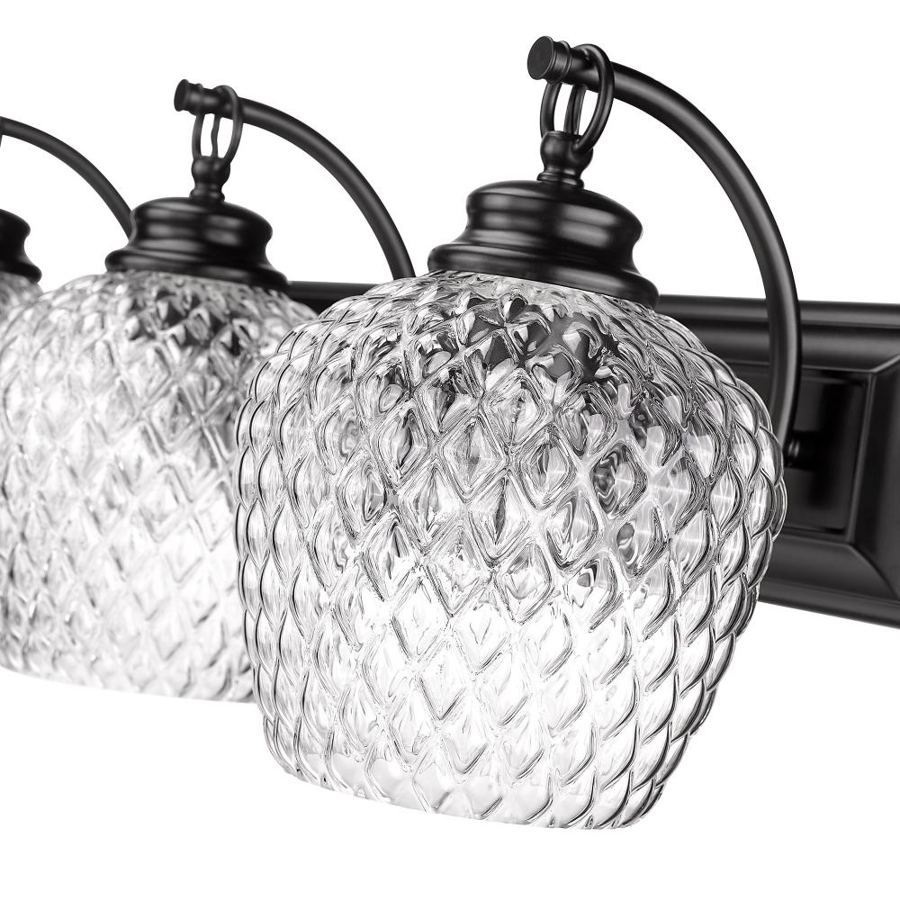 Bring farmhouse elegance into your bathroom with the Golden Lighting Adeline 3-light Vanity. Featuring a glass shade and a Matte Black frame, it creates a welcoming atmosphere. The clear glass shade allows for brilliant, unobstructed light, perfectly showcasing the warmth and character of your bulb. Its polished finish enhances the overall aesthetic while providing a vintage-inspired touch. The Matte Black finish is timeless and endlessly versatile, offering a sophisticated look that complements various decor styles from minimalist to industrial. Specifically designed for bathroom spaces, this fixture is damp location rated, making it suitable for areas with occasional moisture. Requires 3 E26 Medium base bulbs (not included) with a maximum wattage of 100 per bulb. Overall Dimensions: 26.25"W x 10"H x 9.5"D. Transform your vanity area with a blend of modernity and charm, ensuring both style and practicality.