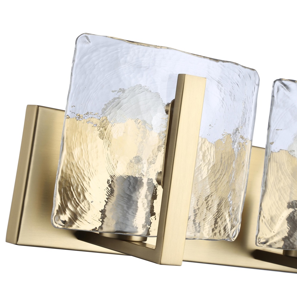 Bring nature-inspired elegance into your home with the Golden Lighting Aenon 2-light Vanity in Brushed Champagne Brass. Featuring a glass shade and a stunning brushed champagne brass finish, it creates a welcoming atmosphere. The hammered water glass shade showcases a beautifully distorted light effect that mimics the beauty of ice and water. This finish offers an understated yet chic aesthetic with a soft satin sheen that complements contemporary interiors perfectly. Brighten up your bathroom with dedicated lighting that flatters while providing practical task illumination. Rated for damp locations, it measures 14.25"W x 6.75"H x 5.88"D and requires two E26 medium base bulbs (not included) with a maximum wattage of 100 per bulb. Elevate your space with this sophisticated fixture that marries artistry and functionality seamlessly.