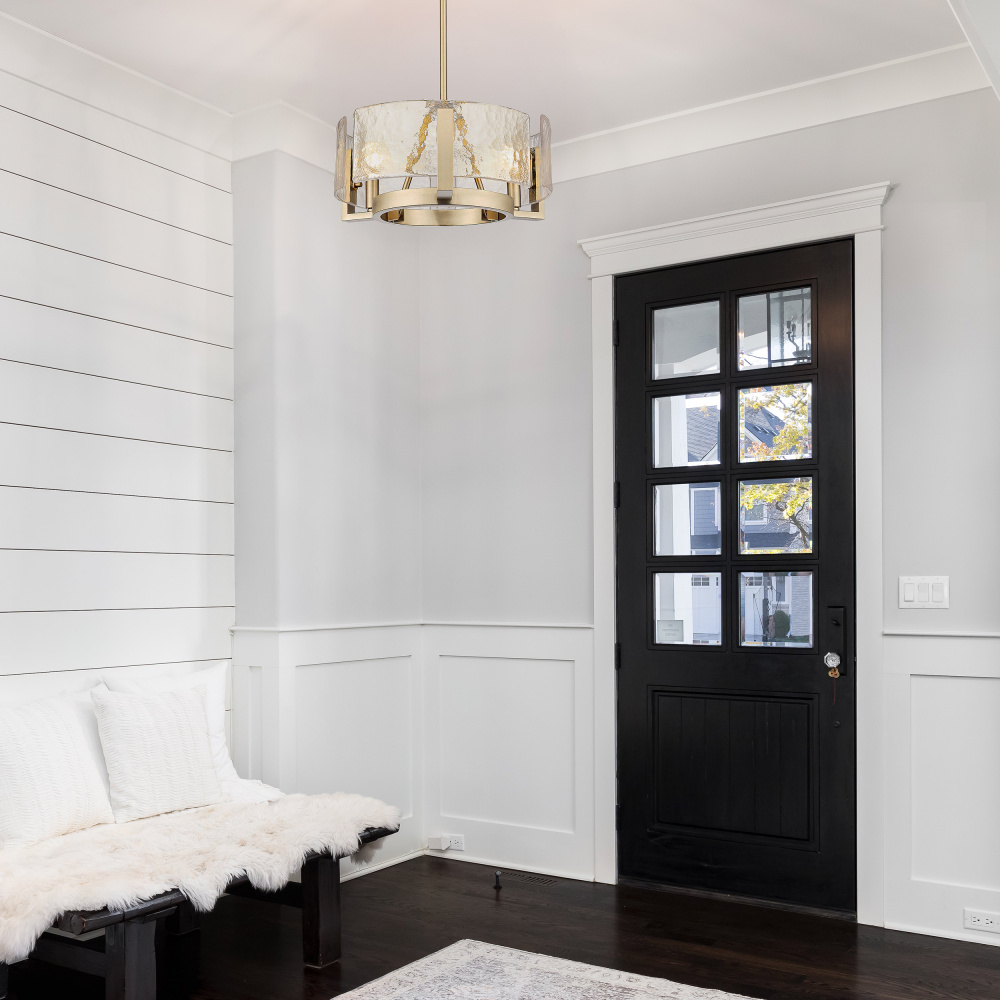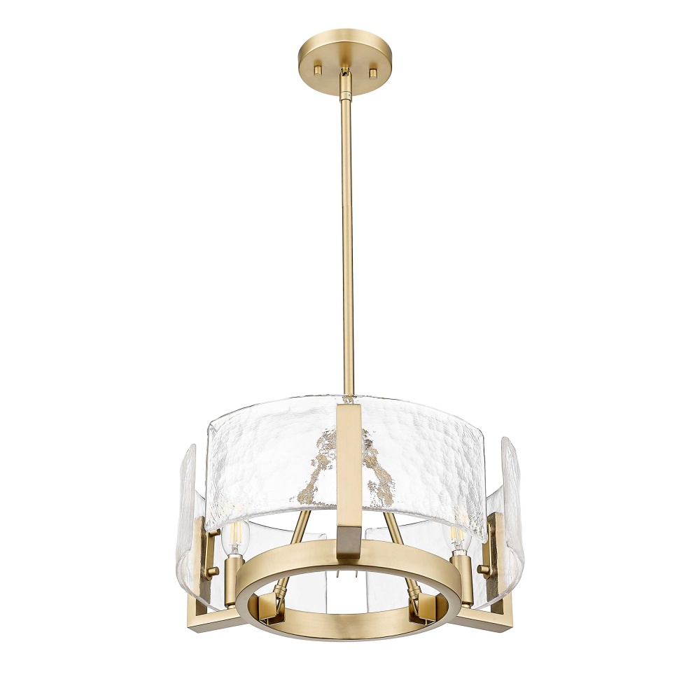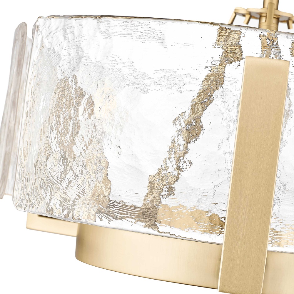 Elevate your interior with the Golden Lighting Aenon 3-light Chandelier. This exquisite fixture features a glass shade, bringing nature-inspired elegance into your home. The Hammered Water Glass shade showcases a rich texture that evokes the beauty of water, diffusing light in a captivating manner. The Brushed Champagne Brass finish offers a chic and contemporary aesthetic, achieved through a durable electroplating process to create a refined and soft satin sheen that enhances any decor. Ideal for dining rooms, foyers, and living spaces, this damp location rated chandelier provides versatility and safety in areas with occasional moisture. Its convertible design allows for adjustable height from 10.75" to 58", making it suitable for various ceiling configurations. It requires 3 E12 candelabra base bulbs (not included) with a maximum wattage of 60. Overall dimensions are 16.5"W x 8.38"H x 16.5"D. Infuse your home with a touch of luxury and artistry, making every meal and gathering memorable under this stunning chandelier.