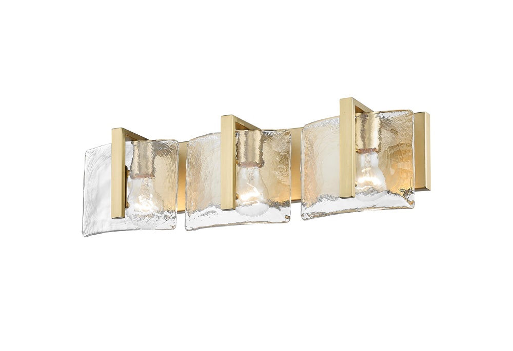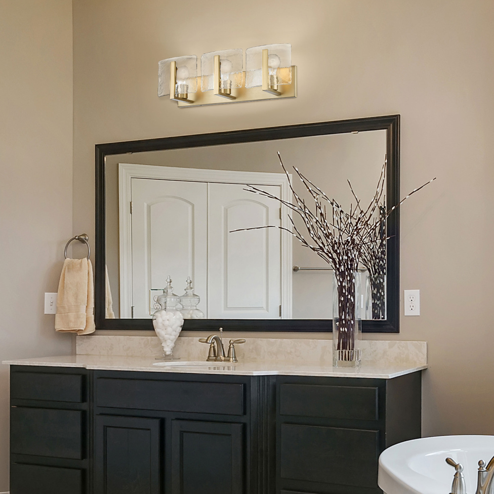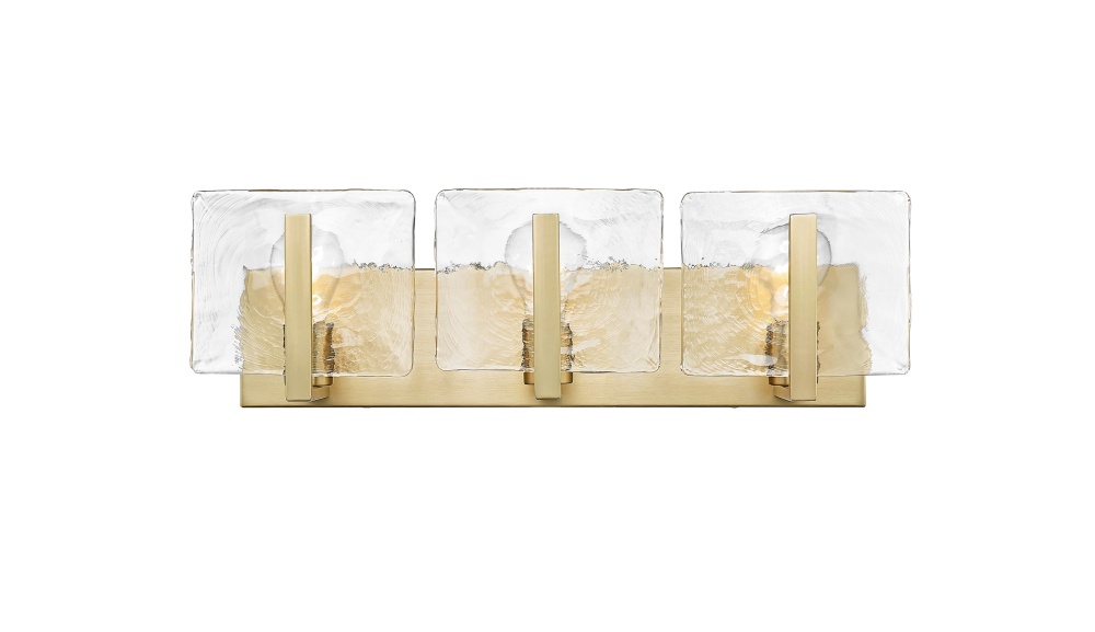Bring nature-inspired elegance into your home with the Golden Lighting Aenon 3-light Vanity in Brushed Champagne Brass. Featuring a glass shade and a brushed champagne brass frame, it creates a welcoming atmosphere. The hammered water glass shade showcases a heavy, irregular texture that mimics the beauty of ice and water, creating a dazzling light effect that will transform your space. The brushed champagne brass finish offers understated elegance and contemporary charm, perfect for adding a touch of luxury to any interior. This vanity light is ideal for brightening up bathrooms, providing practical task illumination while complementing your decor. Damp Location Rated: Suitable for covered and semi-enclosed spaces with occasional moisture, like bathrooms and laundry rooms. Overall Dimensions: 21.75"W x 6.75"H x 5.88"D. Requires 3 E26 Medium base bulbs (not included), with a maximum wattage of 100 per bulb. Celebrate quality and artistry with this stunning fixture that adds a classy touch to any bathroom.