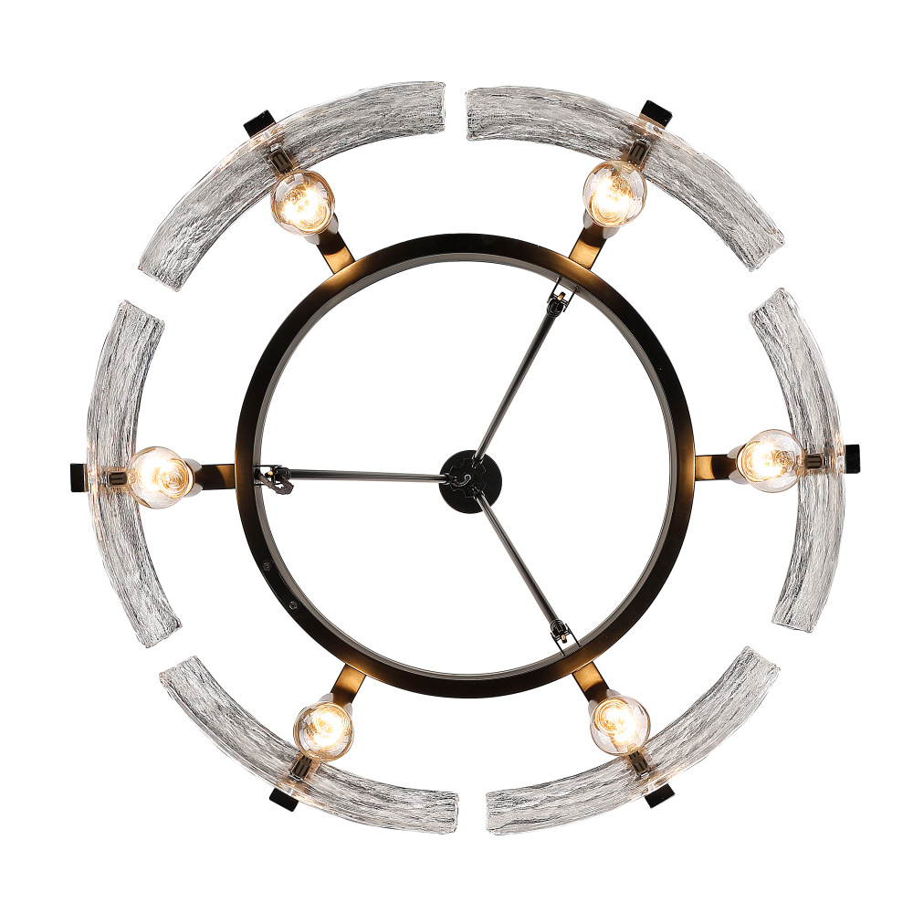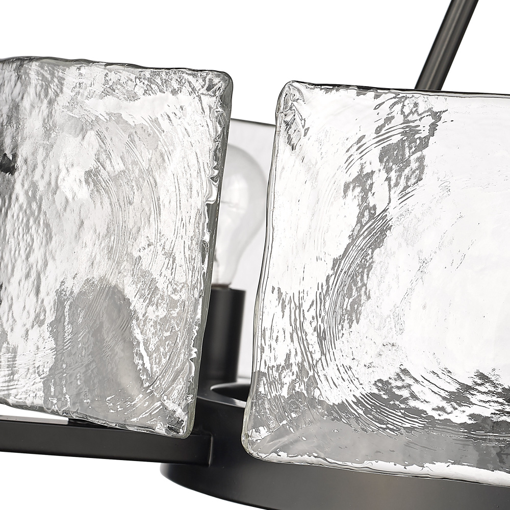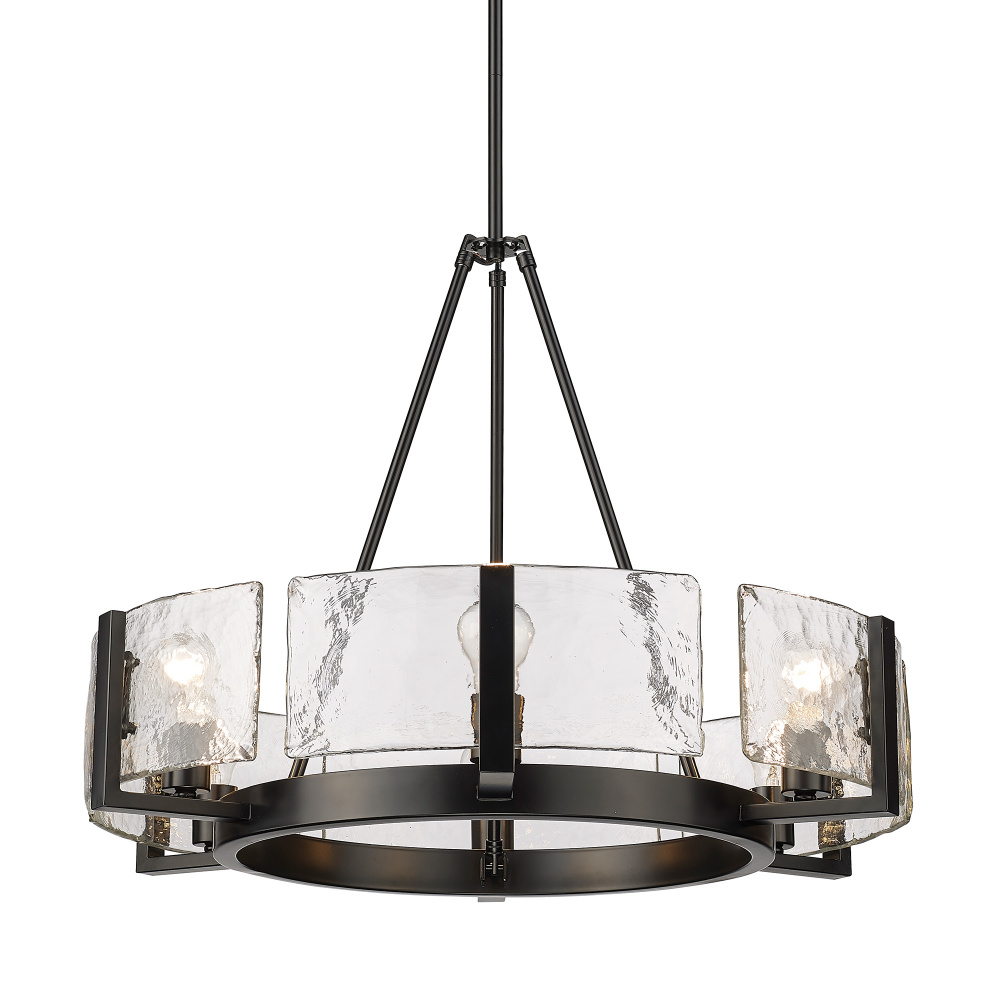 Bring nature-inspired elegance into your home with the Golden Lighting Aenon 6-light Chandelier. Featuring a glass shade and a matte black frame, it delivers a bold and elegant statement. The hammered water glass shade features a dynamic texture that creates captivating light patterns, reminiscent of natural elements. Our matte black finish provides a timeless, versatile backdrop, enhancing any decor style from industrial to contemporary. This chandelier is suitable for damp locations, making it perfect for dining rooms, foyers, and living spaces. The convertible design allows it to be installed as either a semi-flush mount or a pendant, with adjustable height from 23.625" to 65.625". Overall dimensions are 27.75"W x 21"H x 27.75"D, and it requires 6 E26 medium base bulbs (not included, max 60 wattage per bulb). Elevate your interior with this beautifully crafted fixture that emphasizes quality and artistry.