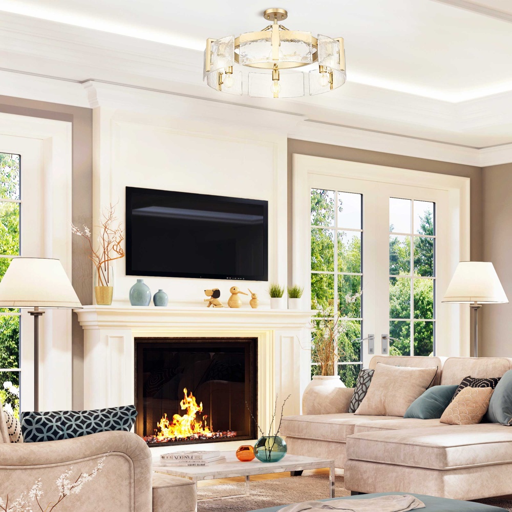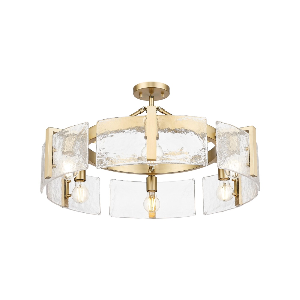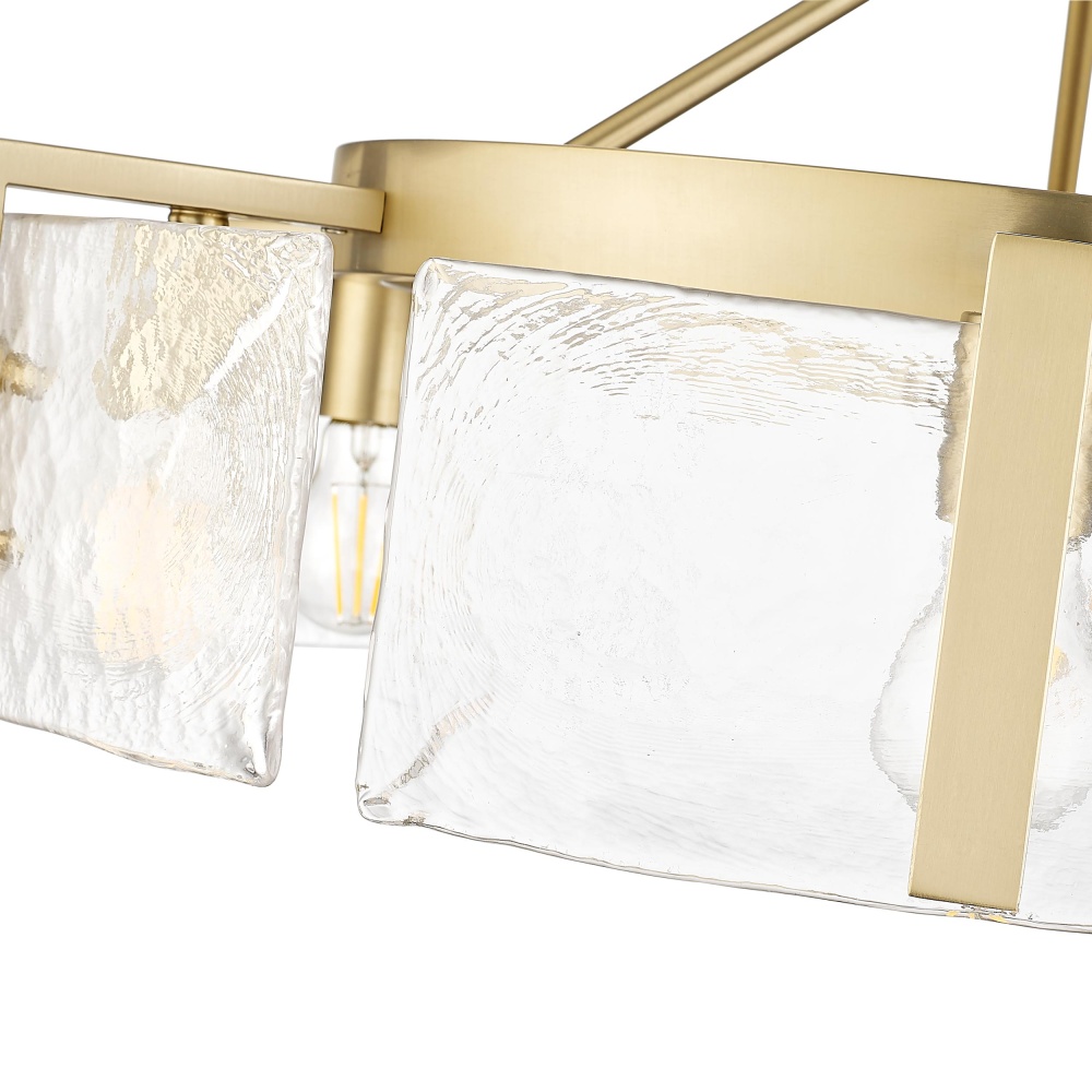 Bring nature-inspired elegance into your home with the Golden Lighting Aenon 6-light Semi-Flush Mount in Brushed Champagne Brass. Featuring a glass shade and a brushed champagne brass frame, it creates a welcoming atmosphere. The glass shade showcases hammered water glass, known for its heavy texture that replicates the beauty of melting ice and flowing water. The glossy finish captures and refracts light beautifully, delivering a dazzling glow that enhances any room. This brushed champagne brass finish offers an elegant alternative to traditional gold, blending warmth and sophistication effortlessly. Ideal for entryways, kitchens, and bedrooms, this semi-flush mount is damp location rated for spaces with occasional moisture. Its adjustable height ranges from 8.75" to 14", making it versatile for different ceiling heights. Overall Dimensions: 27.75"W x 8.75"H x 27.75"D. Requires 6 E26 Medium base bulbs (not included), max 60 watts each. The Golden Lighting Aenon Semi-Flush Mount combines quality craftsmanship with stunning design, making it a perfect addition to contemporary spaces.
