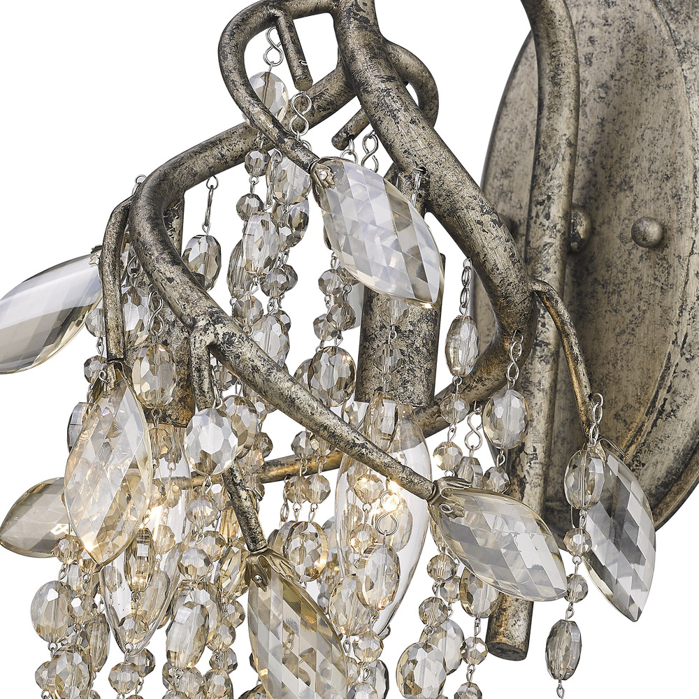 Bring Boho and Glam elegance into your home with the Golden Lighting Autumn Twilight 2-light Wall Sconce in Mystic Gold. It creates a welcoming atmosphere without the need for a shade. Hand-forged to resemble tree branches and enhanced with hand-polished crystal leaves, this sconce's intricate design adds a unique touch to any space, capturing the essence of nature. Our Mystic Gold finish features a deeply textural quality that looks like a treasure from the past, adding gothic romance and dramatic flair. Ideal for dry locations, it's perfect for indoor spaces like bedrooms, living rooms, and hallways. Overall dimensions are 8"W x 15.75"H x 10.5"D, and it requires 2 E12 Candelabra base bulbs (not included) with a maximum of 60 watts per bulb. This beautiful fixture will enhance your home with its rustic charm and quality craftsmanship.