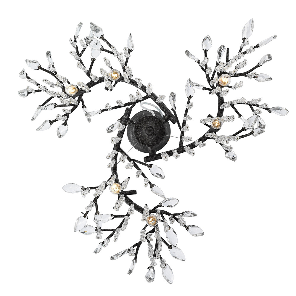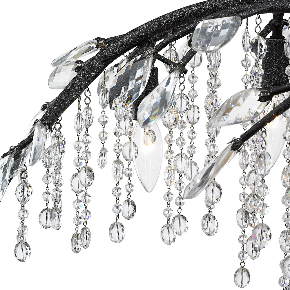Bring Boho elegance into your home with the Golden Lighting Autumn Twilight 6-light Chandelier in Black Iron. This captivating chandelier creates a welcoming atmosphere without a shade, allowing the light to play beautifully off its design. Delicate branches and hand-polished crystal leaves create a mesmerizing display, capturing the essence of nature’s elegance. The Black Iron finish is visually striking with a rustic texture, perfect for adding industrial charm to your decor. Make a grand impression in dining rooms and foyers or elevate bedrooms with this outstanding piece. It is Dry Location Rated, ideal for indoor spaces not subject to moisture, and is sloped-ceiling compatible with Adjustable Height - Min: 17.75"- Max: 110.25". Overall Dimensions: 31"W x 14.25"H x 31"D, using 6 E12 Candelabra base bulbs (not included), with a maximum wattage of 60 each. Experience the unique charm that transforms any room into a showcase of sophistication.