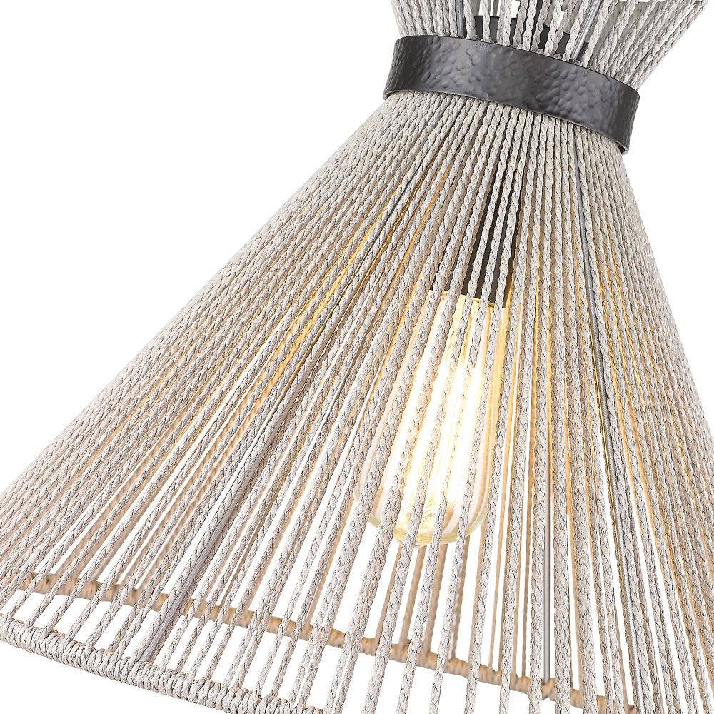Bring boho elegance into your home with the Golden Lighting Avon 1-light Pendant. Featuring a rope shade and a matte black frame, it creates a welcoming atmosphere. The bleached raffia shade is crafted with intricately twisted strands, creating a beautifully textured surface that radiates warm light, enriching your space with character and warmth. The matte black finish embodies clean, modern style, with its deep, uniform black color providing a timeless, versatile look that complements any decor. Perfect for adding a stylish touch to kitchens, dining rooms, or entryways, this fixture is damp location rated, ensuring safety in covered areas exposed to moisture. Overall Dimensions: 16"W x 13.25"H x 16"D. Requires 1 E26 Medium base bulb (not included), max 100 wattage per bulb. Sloped-ceiling compatible and adjustable height from 17" to 58.75". Elevate your home’s ambiance with the Golden Lighting Avon 1-light Pendant, blending functional design with exquisite artistry.