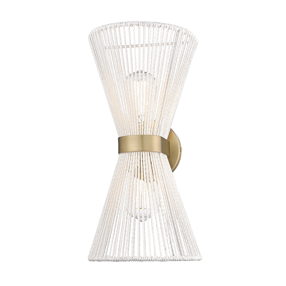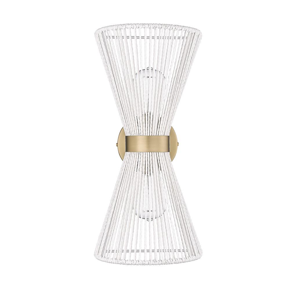 Bring boho elegance into your home with the Golden Lighting Avon 2-light Wall Sconce. Featuring a rope shade and a brushed champagne brass frame, it creates a welcoming atmosphere. The bleached white raphia rope shade offers a highly textured and organic appearance, perfectly capturing the breezy, coastal vibe. This exquisite material is handwoven, providing a unique artisanal touch and a gentle diffusion of light. The brushed champagne brass finish epitomizes modern sophistication, blending warmth with a soft satin sheen that beautifully catches the light. Perfect for enhancing hallways, stairways, or adding cozy ambiance in bedrooms and dining rooms, this fixture is damp location rated, making it suitable for covered areas with occasional moisture. Overall Dimensions: 8.13"W x 16.63"H x 7.5"D. Requires 2 E26 Medium base bulbs (not included), max 60 wattage per bulb. Elevate your space with the Golden Lighting Avon 2-light Wall Sconce, where quality craftsmanship meets timeless design.