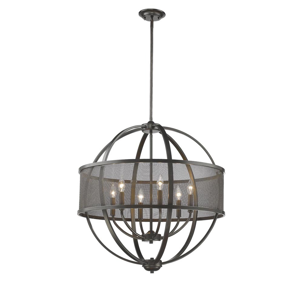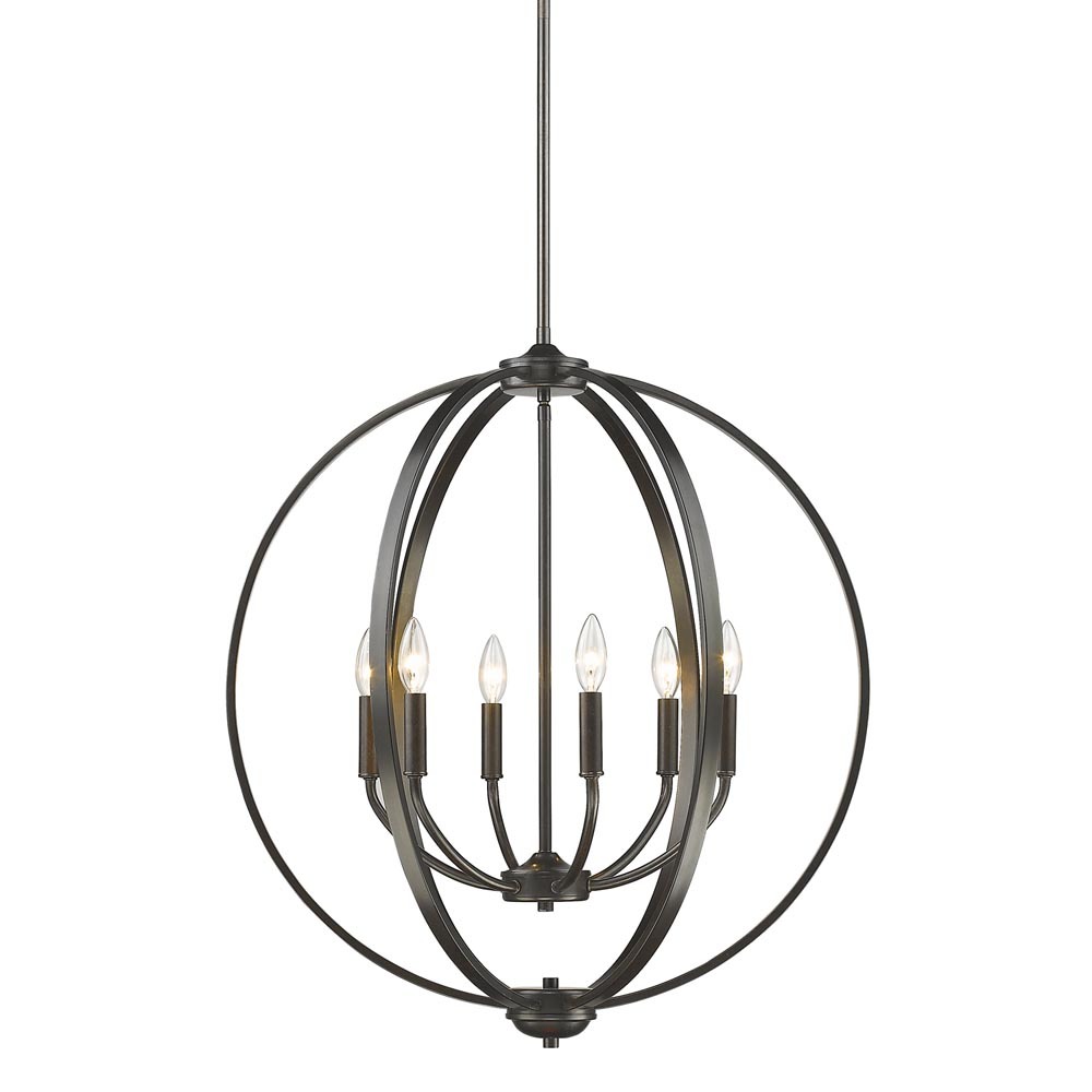 Bring timeless elegance into your home with the Golden Lighting Colson 6-light Chandelier in Etruscan Bronze. With its rich historical character and no shade design, this chandelier creates a welcoming atmosphere. Boasting a vintage-inspired structure without a shade, the classic candelabra design allows for unobstructed light, perfect for creating ambience in any space. The deep, earthy bronze finish adds a sense of warmth and grounded history to your decor, while its adjustable height, ranging from 31.375" to 73.375", allows for versatile placement. Rated for dry locations, it enhances indoor areas like bedrooms, dining rooms, and hallways with effortless sophistication. Overall Dimensions: 26"W x 28.75"H x 26"D. Requires 6 E12 Candelabra base bulbs (not included) with a maximum wattage of 60 per bulb. Elevate your interiors with the quality and charm inherent in this exquisite chandelier.