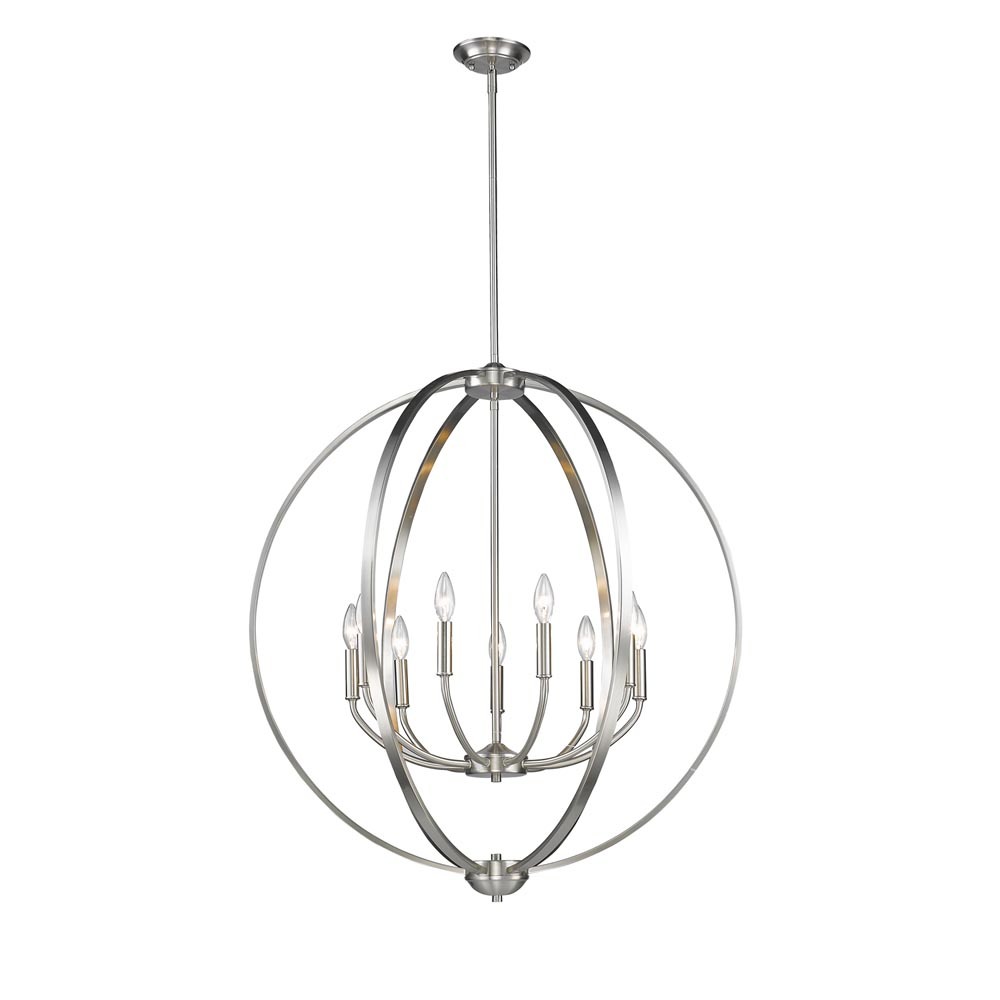 Bring Transitional charm into your home with the Golden Lighting Colson 9-light Chandelier in Pewter. Featuring a sophisticated frame and a timeless hue, it creates a warm and welcoming atmosphere. This exquisite chandelier showcases a classic candelabra beautifully housed within a clean, open-orb frame, striking a perfect balance of styles. The Pewter finish offers a soft, medium-grey hue with subtle warmth, creating an elegant, non-glare glow. Ideal for dining rooms and foyers, it is Dry Location Rated, making it perfect for dry indoor spaces. The fixture is Sloped-Ceiling Compatible and features an Adjustable Height of Min: 37.375"- Max: 79.375", allowing for easy installation flexibility. Overall Dimensions: 31.25"W x 34.75"H x 31.25"D. Requires 9 E12 Candelabra base bulbs (not included), with a maximum wattage of 60 per bulb. Enhance your decor with this stunning chandelier, fusing functionality with contemporary design.
