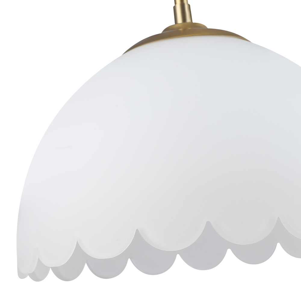 Bring transitional elegance into your home with the Golden Lighting Dorinda 1-light Pendant. Featuring a glass shade and a brushed champagne brass frame, it creates a welcoming atmosphere. The opal glass shade features a milky, translucent white color with a smooth, satin-matte finish, designed to diffuse light evenly for a soft, glare-free glow. This timeless and elegant piece beautifully illuminates your space while adding understated sophistication. The brushed champagne brass finish is the epitome of modern sophistication, skillfully blending warmth with a soft sheen to create a chic and versatile color. Perfect for adding a touch of quiet luxury to any interior. Perfect for entryways, foyers, kitchens, dining rooms, or even bathrooms, where focused yet decorative illumination is desired. This pendant is damp location rated, making it suitable for covered and semi-enclosed spaces. It is also sloped-ceiling compatible and features an adjustable height (min: 53.875" - max: 8.75"). Overall dimensions are 12.25"W x 8.75"H x 12.25"D, and it requires one E26 medium base bulb (not included), with a maximum wattage of 100. Elevate your home's ambiance with this stylish, crisp accent piece that embodies both quality and design.
