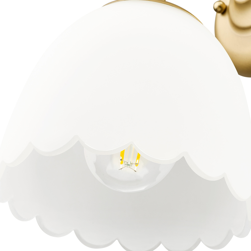 Bring timeless elegance into your home with the Golden Lighting Dorinda 1-light Wall Sconce. Featuring a glass shade and a Brushed Champagne Brass frame, it creates a welcoming atmosphere. The opal glass shade provides a beautiful, luminous glow, diffusing light evenly for a soft, glare-free ambiance. Its smooth, satin-matte surface adds an ethereal quality, making it a versatile choice for various rooms. The Brushed Champagne Brass finish offers a sophisticated alternative to traditional gold, blending the warmth of brass with the softness of silver, perfect for adding a touch of luxury. Ideal for enhancing hallways, stairways, or cozy ambiance in bedrooms and dining rooms, this fixture is damp location rated, making it suitable for bathrooms and covered porches. Overall Dimensions: 6.5"W x 11"H x 7.5"D, and requires 1 E26 medium base bulb (not included), max 100 watts. Elevate your spaces with style and quality.