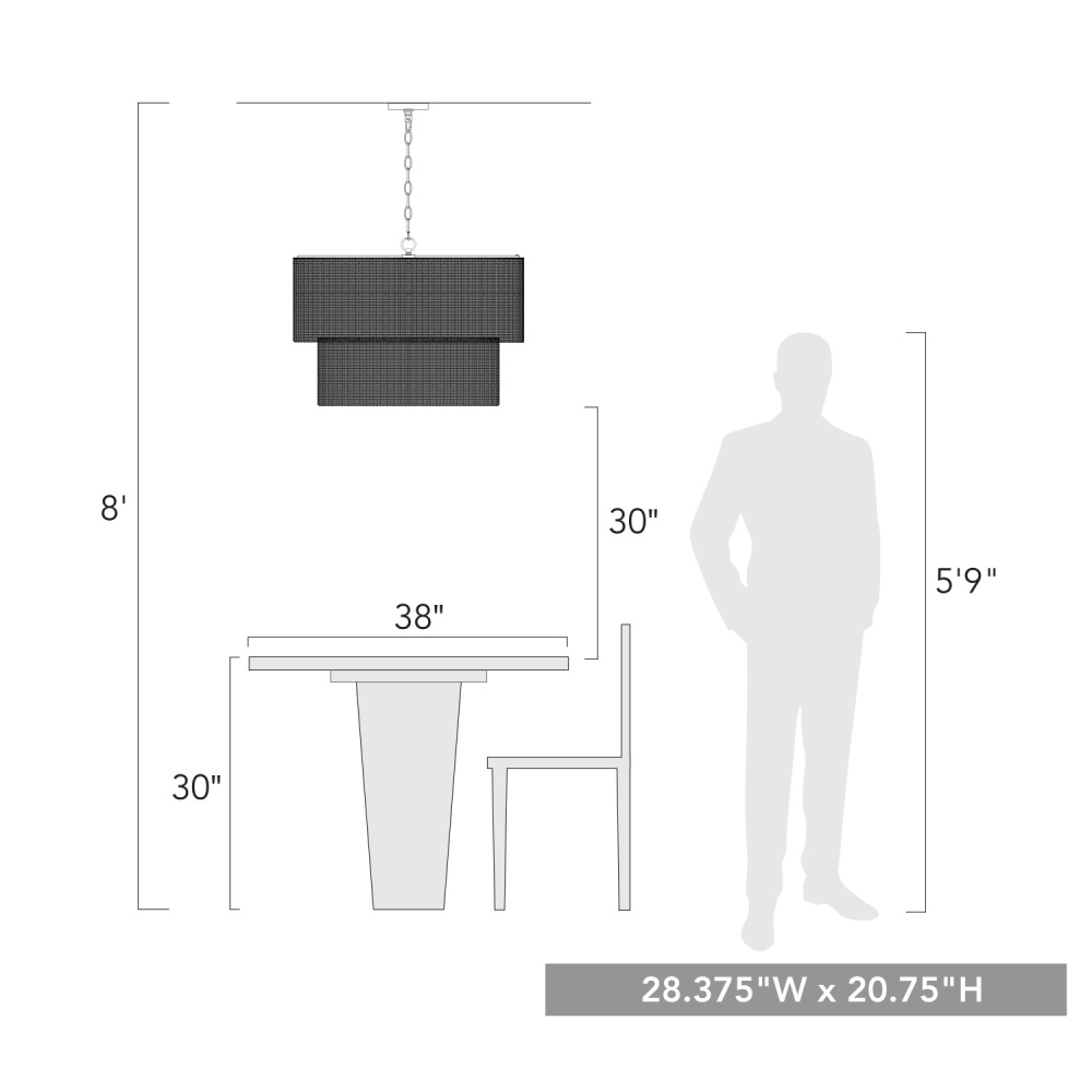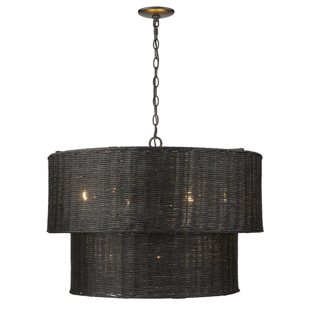 Bring coastal elegance into your home with the Golden Lighting Erma 9-light Chandelier. Featuring a wicker shade and a matte black frame, it creates a welcoming atmosphere. The black wicker shade, meticulously hand-woven from durable material, offers a bold, textural statement that gently filters light, adding an inviting glow to your space. The epitome of clean, modern style, the matte black finish is timeless and versatile, complementing decor from minimalist to contemporary. Make a grand impression in dining rooms or enhance living spaces with classic elegance. The chandelier is dry location rated, perfect for indoor areas free from moisture, such as bedrooms and living rooms. It is sloped-ceiling compatible and features an adjustable height from 21.875" to 93.875", allowing for customized installation. Overall dimensions are 28.38"W x 20.75"H x 28.38"D, and it requires 9 E26 medium base bulbs (not included), with a maximum wattage of 60 per bulb. Illuminate your home with style and quality, where every corner reflects your sophisticated taste.