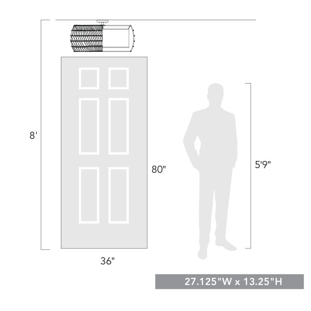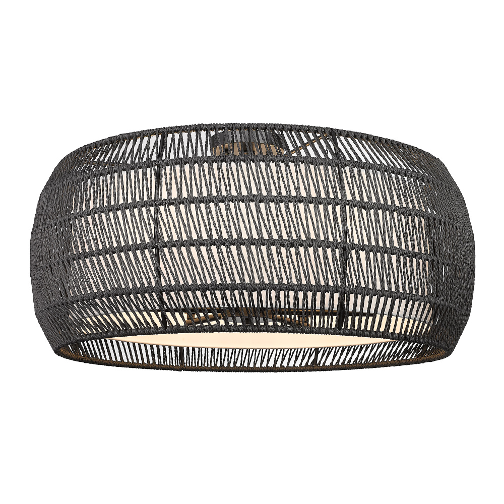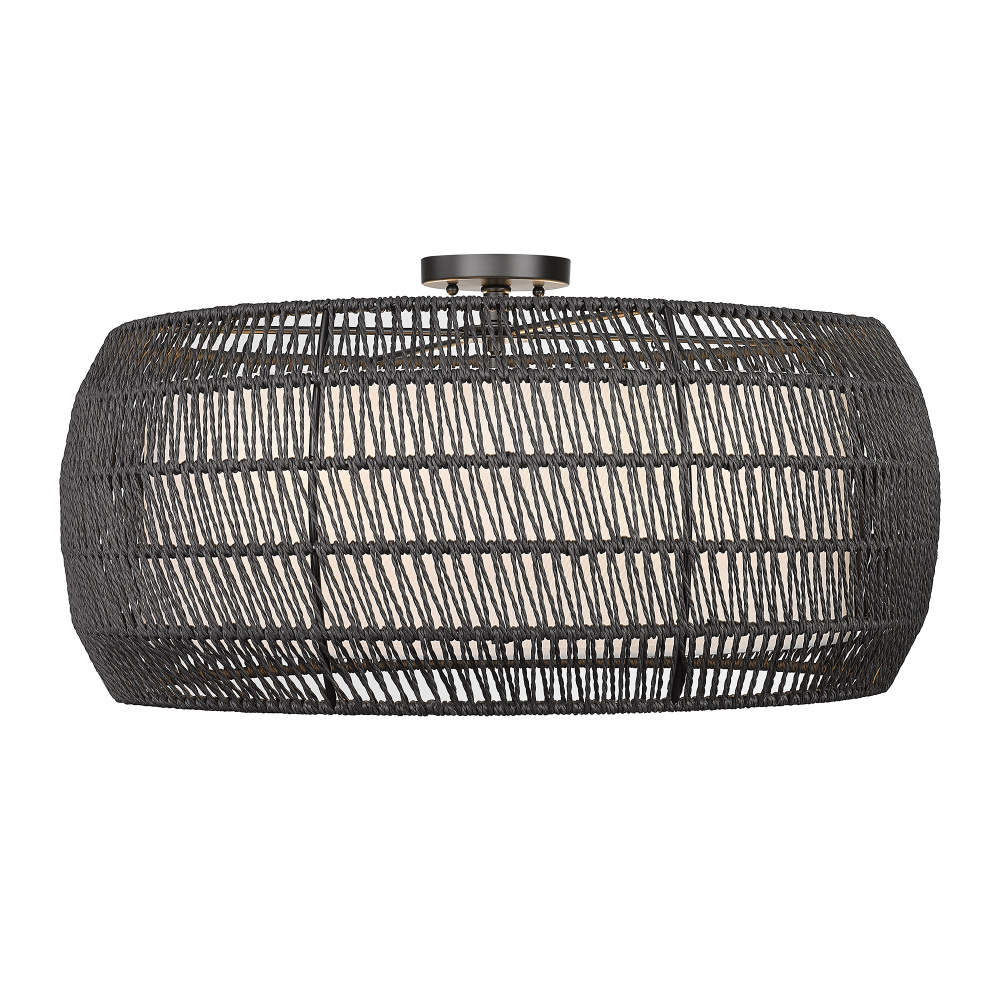 Introduce a blend of style and functionality with the Golden Lighting Everly 6-light Semi-Flush Mount. Featuring a modern black rattan shade and a matte black frame, it elevates your home ambiance. The fabric shade showcases a modern black rattan design, hand-woven in an open, airy pattern that beautifully interacts with light, rendering a subtle yet dynamic play of shadows. Crafted in a matte black finish, this fixture resonates with clean lines and a sophisticated quality, suitable for a range of decor styles from contemporary to bohemian. This semi-flush mount light is perfect for kitchens, entryways, and living areas with mid-height ceilings. It's damp location rated, ensuring safe illumination in spaces with occasional moisture. With its convertible construction, it provides flexible installation options for varying ceiling heights. With dimensions of 27.13"W x 13.25"H x 27.13"D, this fixture requires six E12 candelabra base bulbs (not included), with a maximum wattage of 60 per bulb. Elevate your living space with the Golden Lighting Everly Semi-Flush Mount, an exquisite balance of function and elegance.