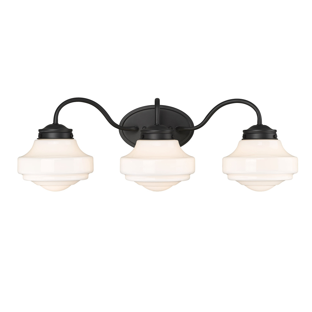 Illuminate your space with vintage charm! Bring Traditional elegance into your home with the Golden Lighting Ingalls 3-light Vanity in Matte Black. Featuring a glass shade and a Matte Black frame, it creates a welcoming atmosphere. The Vintage Milk Glass shade provides a smooth surface with a glossy sheen, allowing for a soft and glare-free glow that is warm and inviting. The Matte Black finish is perfectly smooth, absorbing light and offering an understated elegance that complements various decor styles from minimalist to bold. Damp Location Rated, this vanity light is perfect for bathrooms, covered porches, and laundry rooms where occasional moisture may arise. Overall Dimensions: 27.5"W x 9.38"H x 8.88"D, Requires 3 E26 Medium base bulbs (not included) with a maximum wattage of 100 per bulb. Elevate your bathroom decor with quality craftsmanship and a timeless design.