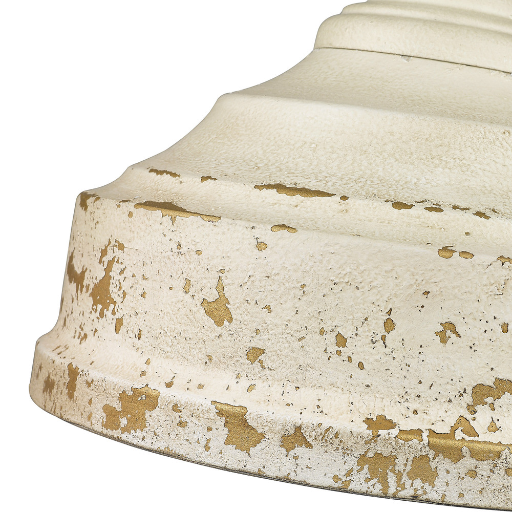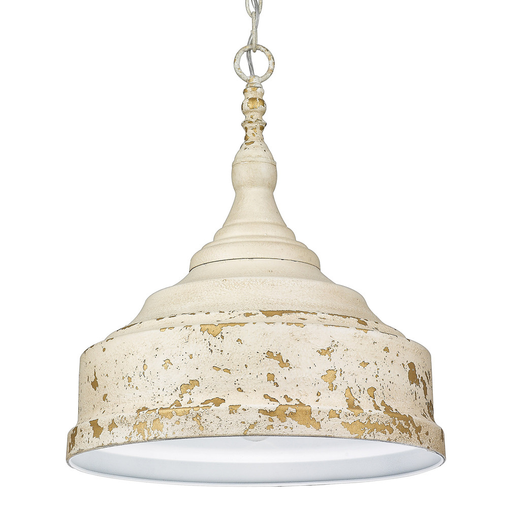 Bring classic farmhouse elegance into your home with the Golden Lighting Keating 3-light Pendant. Featuring a metal shade and a striking Antique Ivory frame, it creates a welcoming atmosphere. The metal shade offers a matte, cracked texture that diffuses light beautifully, enhancing any space with a warm glow. Evoking the timeless charm of a treasured European heirloom, the Antique Ivory finish is rich with character and history, featuring purposeful chips and weathering that reveal unexpected glints of a warm, gilded underlayer. This versatile pendant light is perfect for focused yet decorative illumination in kitchens, dining rooms, or entryways. Damp Location Rated, it is suitable for covered spaces with occasional moisture, and it is easily installed on sloped ceilings with an adjustable height ranging from 22.75" to 94.75". Overall Dimensions: 16.5"W x 19.75"H x 16.5"D. Requires 3 E26 Medium base bulbs (not included), with a maximum wattage of 60 per bulb. Elevate your home décor with this handcrafted piece that celebrates quality and distinct character.