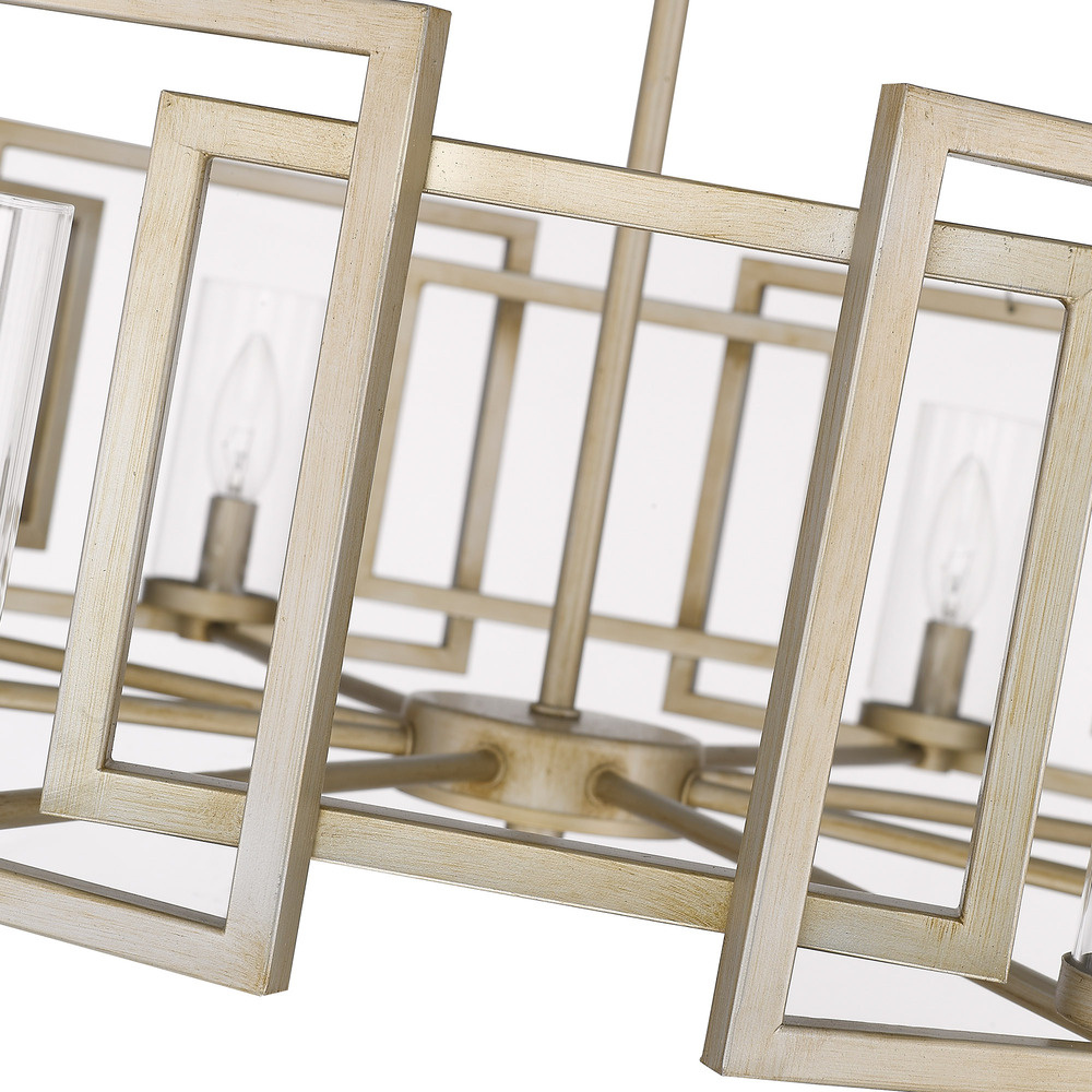 Bring artisanal glamour into your home with the Golden Lighting Marco 8-light Chandelier in White Gold. Featuring a glass shade and a beautiful white gold frame, it creates a welcoming atmosphere perfect for entertaining. The clear glass shade provides unobstructed brilliance, allowing the soft glow of the bulbs to shine through. Polished and timeless, this shade works seamlessly with various styles, from contemporary to traditional. The white gold finish presents a sophisticated blend of warmth and elegance, making it an ideal choice for those seeking a unique metallic accent in their decor. Its low-lustre glow adds character to any room it graces. Perfect for dining rooms, foyers, or any elegant space, this piece is dry location rated for indoor use, ensuring it thrives where moisture isn’t a concern. Installation is hassle-free with adjustable height features, allowing customization suited to your needs. Overall dimensions are 35.38"W x 32.75"H x 35.38"D, and it requires 8 E12 Candelabra base bulbs (not included) with a maximum of 60 watts per bulb. Transform your interiors with this outstanding combination of style and quality.