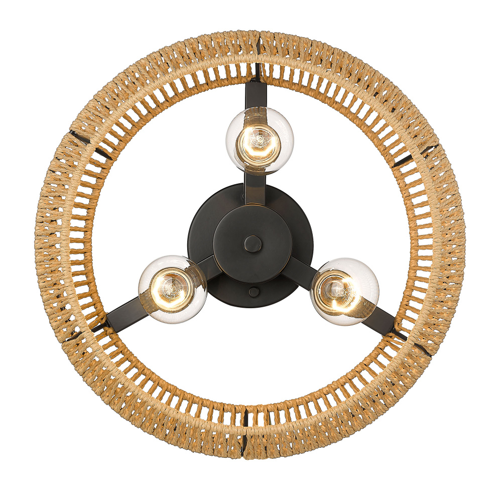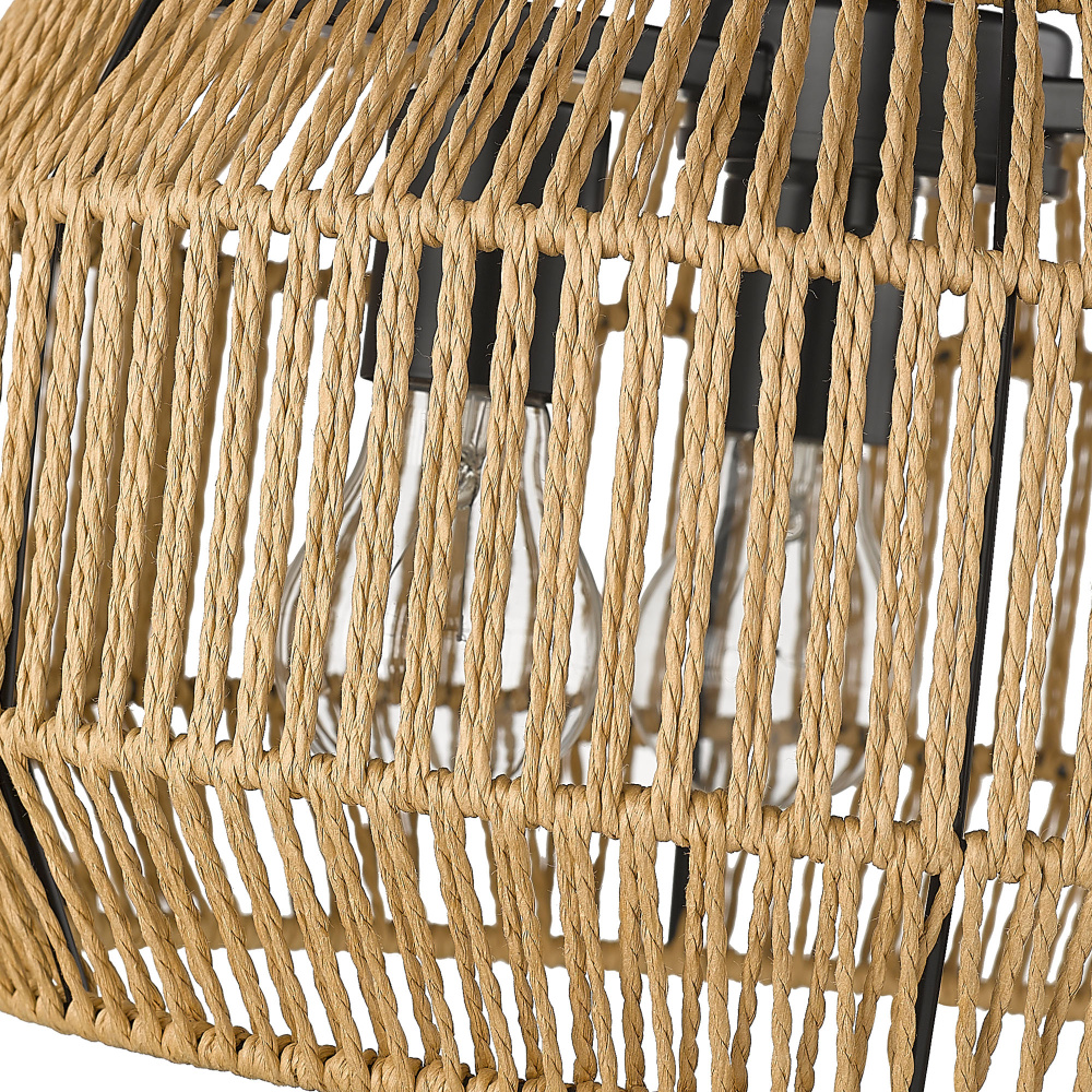 Bring Boho sophistication into your home with the Golden Lighting Marlee 3-light Semi-Flush Mount. Featuring a Rope shade and a Matte Black frame, it creates an inviting ambiance in various settings. The Natural Raphia Rope shade introduces an organic, hand-woven texture, evoking a breezy coastal feel. This beautifully crafted shade enhances the interplay of light and shadow, enriching the fixture's aesthetic. The Matte Black finish embodies clean, modern style, offering a timeless elegance that complements any décor, from minimalist to contemporary. This semi-flush mount is perfect for entryways, bedrooms, kitchens, and living areas with mid-height ceilings. Damp location rated, it is designed for spaces with occasional moisture. Overall Dimensions: 14"W x 10"H x 14"D. Requires 3 E26 Medium base bulbs (not included), max 100 wattage per bulb. Enhance your living experience with this blend of style and practicality, showcasing artisanal quality in your home.