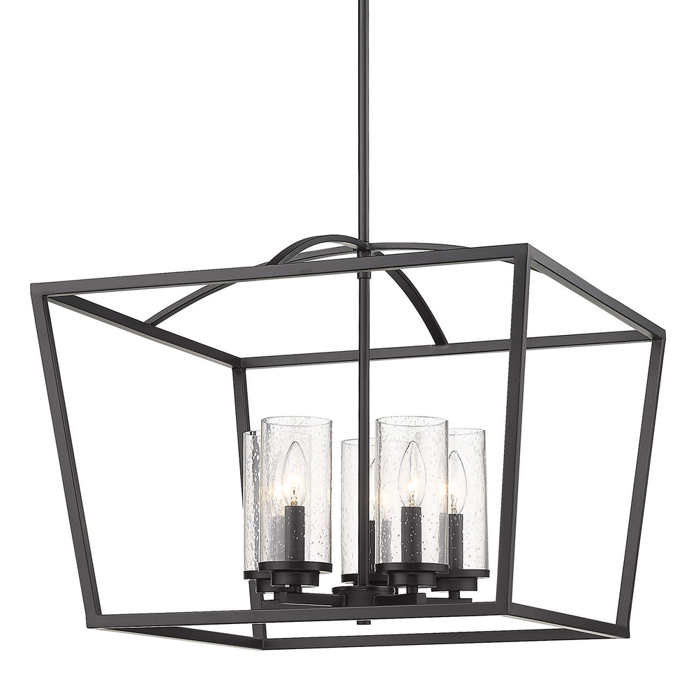 Introduce grand transitional elegance into your home with the Golden Lighting Mercer 5-light Chandelier in Matte Black. Featuring a glass shade and a matte black frame, it creates an inviting atmosphere in any space. The seeded glass shade, showcasing unique air bubbles, provides a beautiful diffusion of light that adds vintage charm to your décor. The matte black finish is versatile and timeless, making it suitable for a variety of interior styles. This chandelier is ideal for dry locations such as dining rooms and foyers, and it can be installed on sloped ceilings with an adjustable height from 20.5" to 62.5". With overall dimensions of 22.13"W x 17.5"H x 22.13"D, it requires five E12 candelabra base bulbs (60W max) to provide stunning illumination. Elevate your home with this exquisite fixture that merges sophistication with functionality.