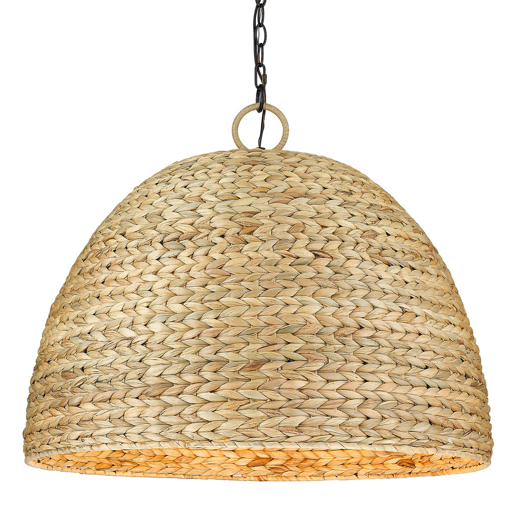Bring bohemian elegance into your home with the Golden Lighting Rue 8-light Chandelier. Featuring a rope shade and a Matte Black frame, it creates a welcoming atmosphere. The rope shade is crafted from handwoven sweet grass in an intricate herringbone pattern, providing a striking textural element. This unique shade showcases a rich tapestry of earthy tans and browns, enhancing the raw beauty of the natural fibers while diffusing light softly throughout your space. The Matte Black finish epitomizes modern style with its smooth, non-reflective surface that absorbs light. This foundational finish harmonizes with various décors, from minimalist to industrial settings. Make a grand impression in dining rooms and foyers or elevate bedrooms and living spaces with its classic elegance. Ideal for dry indoor locations, it is compatible with sloped ceilings and adjustable in height from 25.875" to 95.875". Overall Dimensions: 27"W x 23.13"H x 27"D. Requires 8 E26 Medium base bulbs (not included), with a maximum wattage of 60 per bulb. Close your space with the artistry and quality of this chandelier, cherished for its design and effortless installation.
