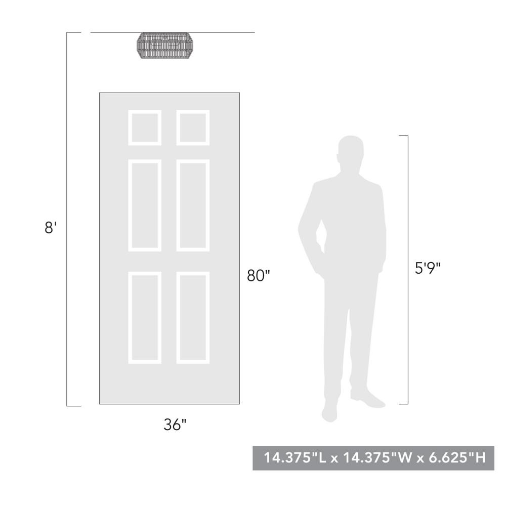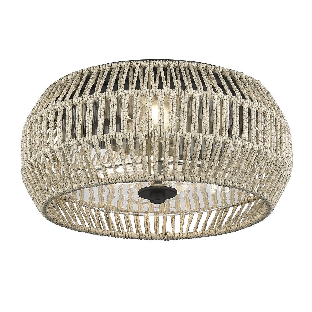 Bring inviting elegance into your outdoor areas with the Golden Lighting Seabrooke 2-light Outdoor Ceiling Light. Featuring a Summer Sands shade and a Natural Black frame, it creates a welcoming atmosphere. The Summer Sands shade is crafted from a unique, hand-woven cord that resembles the soft hues of beach sand, allowing light to filter through beautifully while creating a sense of tranquility in your space. Our Natural Black finish offers a softer, organic feel reminiscent of raw iron, enhanced by its tactile, non-reflective matte surface. Designed for overhead coverage, this light fixture is Wet Location Rated, ensuring durability against rain or snow—ideal for porches, gazebos, or outdoor kitchens. With overall dimensions of 14.38"W x 6.63"H x 14.38"D, it requires two E26 Medium base bulbs (not included) with a maximum wattage of 60 each. Transform your outdoor setting with the charm of this exquisite fixture, ideal for enhancing your bohemian-inspired style while providing reliable lighting.